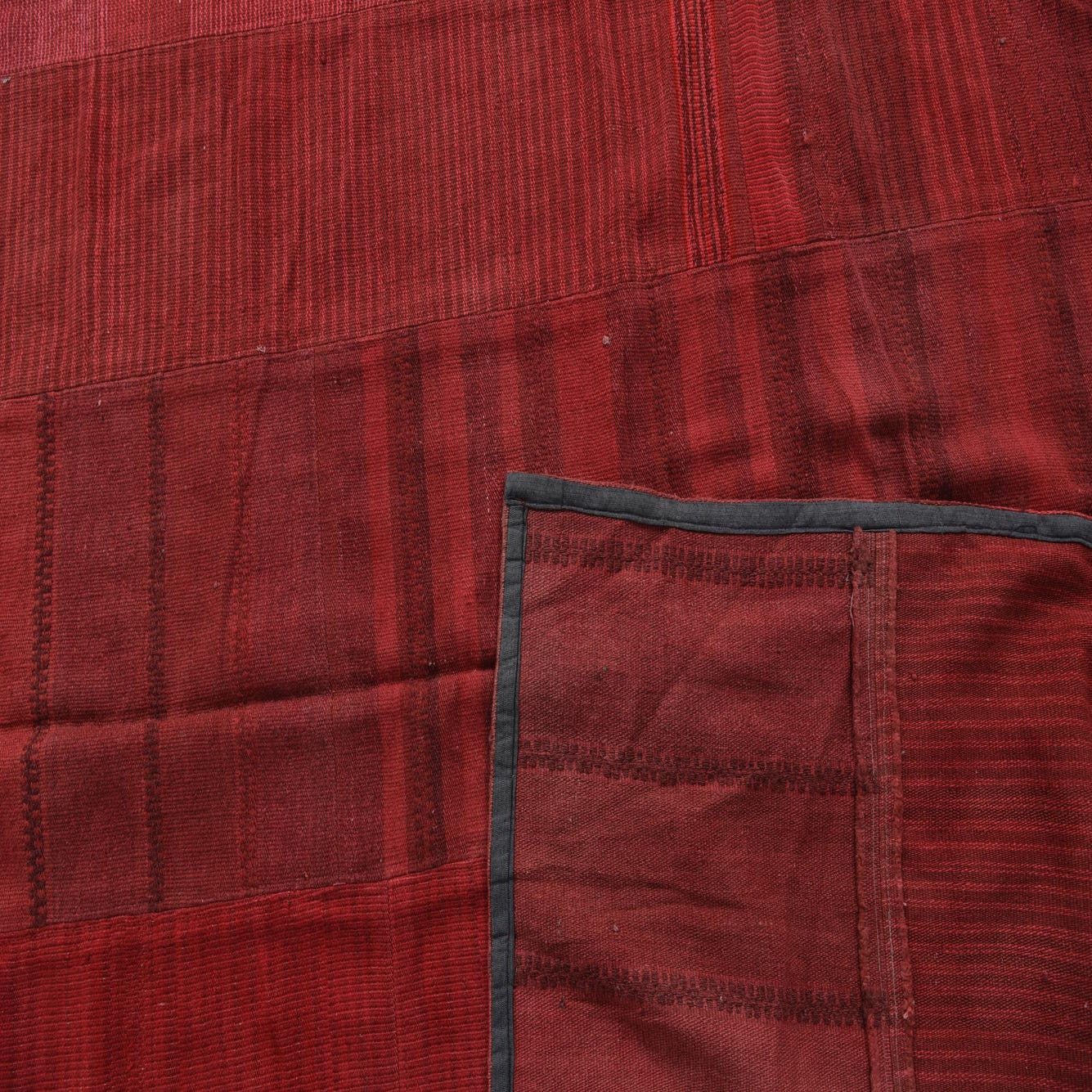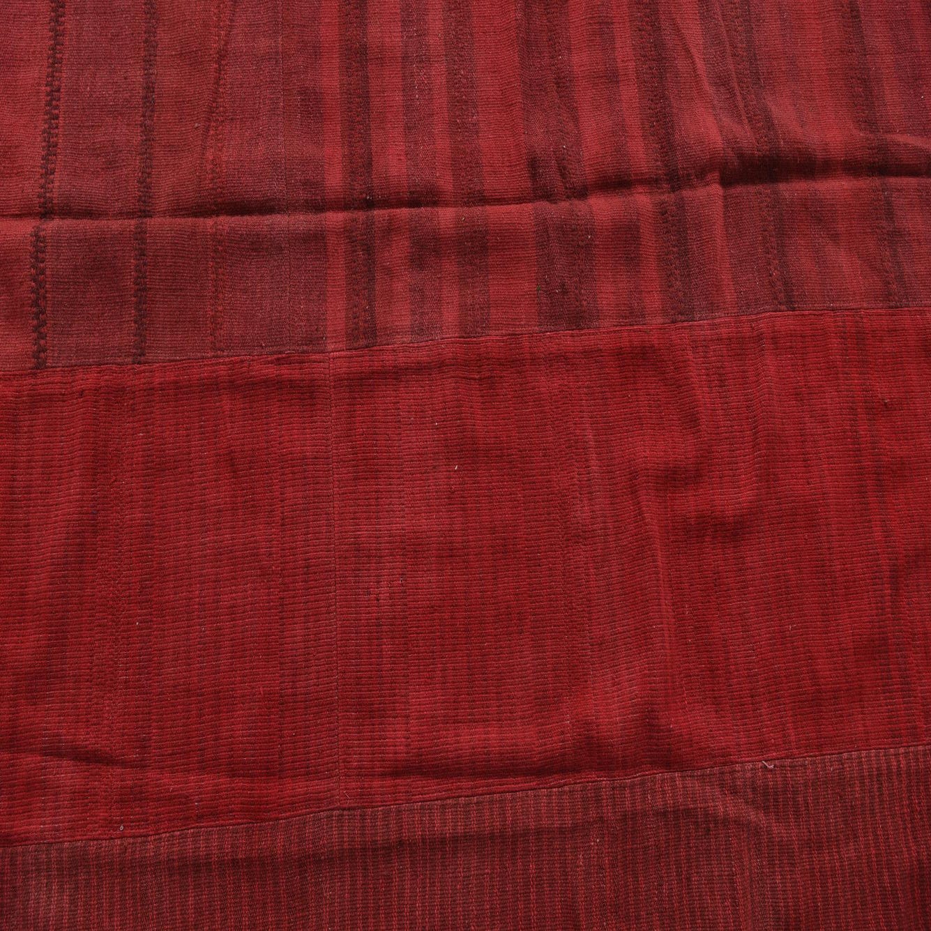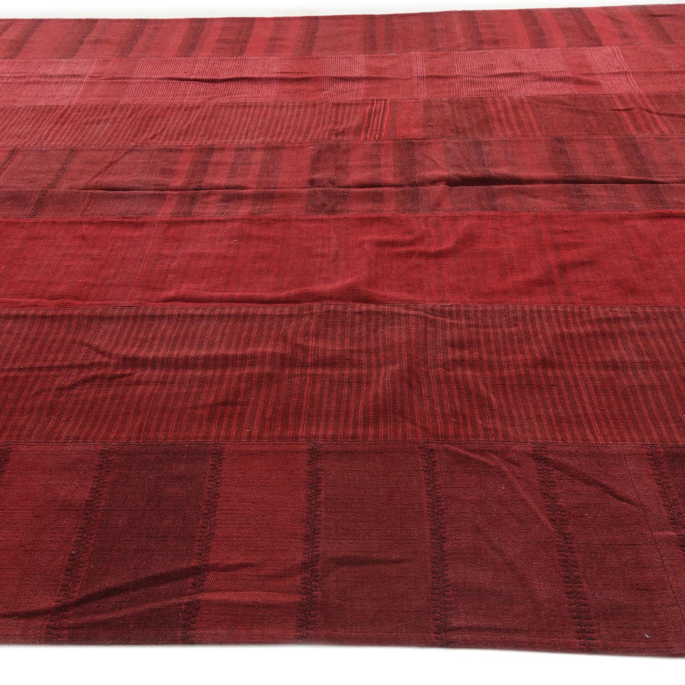 A 10x12 rectangular Kilim Modern rug in varying shades of red, featuring a flatweave tribal pattern.