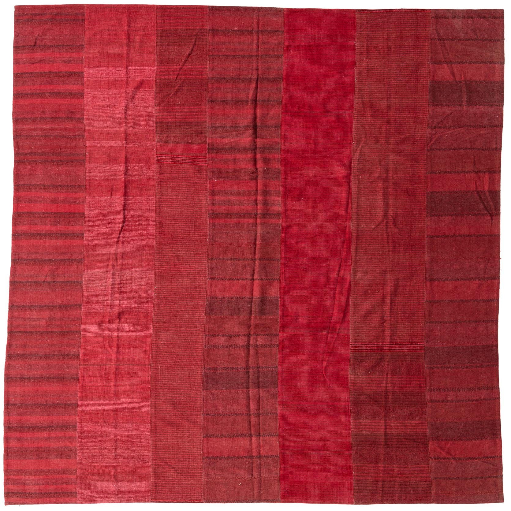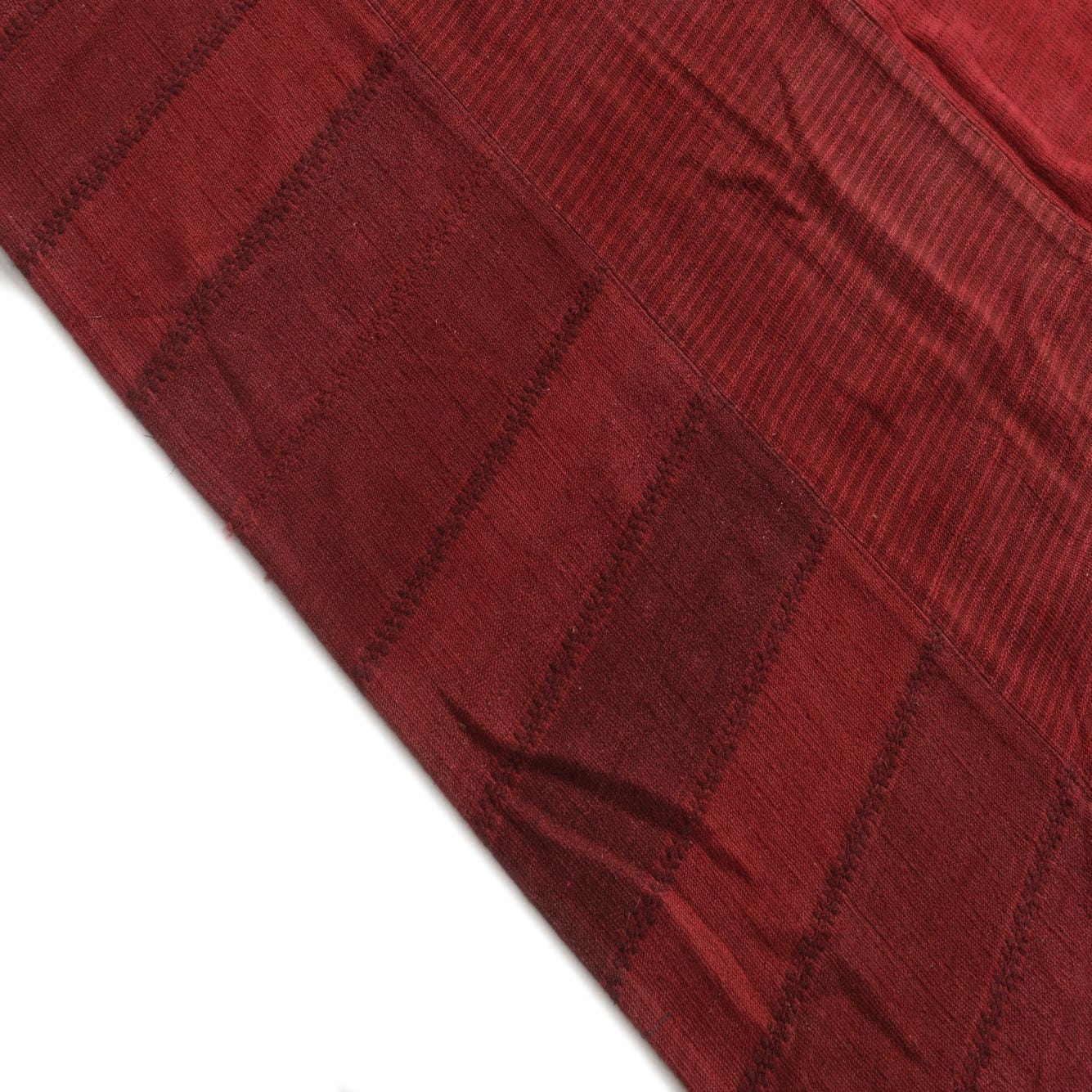 This Kilim Modern collection rug, sized 10x12, presents a hand woven design crafted from 100% wool, providing a durable and tactile surface. The rug's dominant red background is complemented by accents of black and subtle hints of pink, incorporated into its minimalist pattern. Its clean lines and block-like structures offer a contemporary take on traditional kilim motifs.