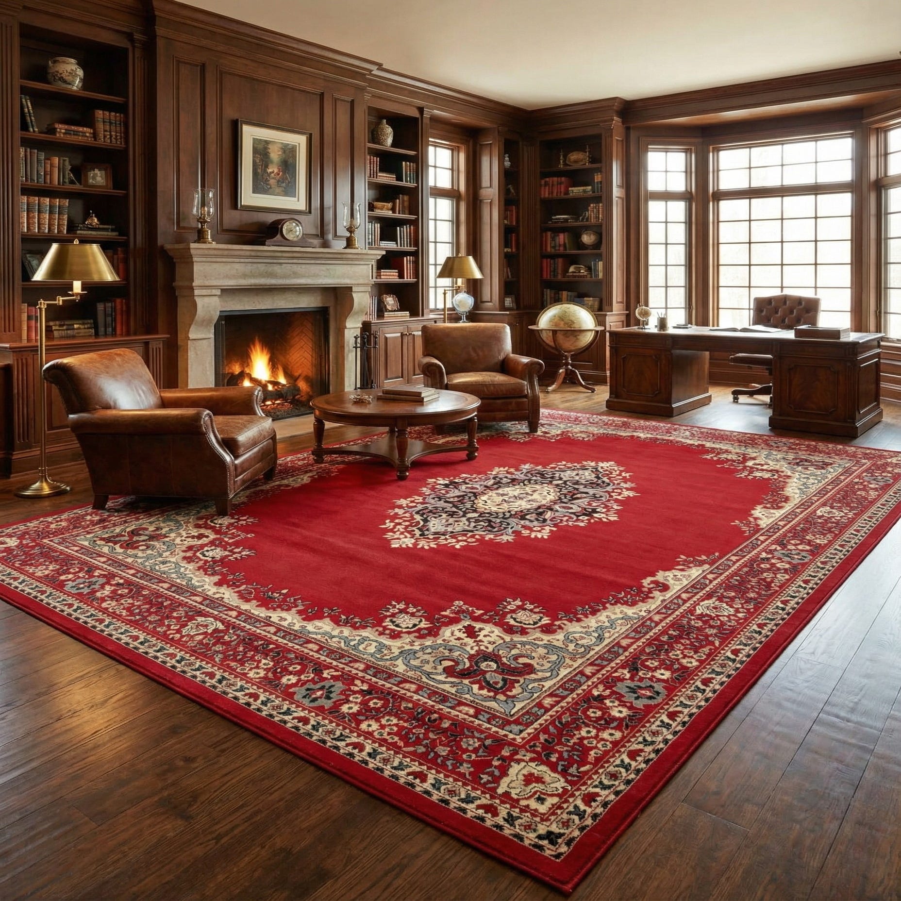 With a plush texture that promotes comfort underfoot, this piece is notable for its stain-resistant properties and its lack of shedding, ensuring both visual appeal and practicality. Its bold color palette and timeless design make it ideal for various interior settings, including living rooms with a traditional or transitional decor, elegant dining spaces, or as a focal point in minimalist designs needing a splash of color.