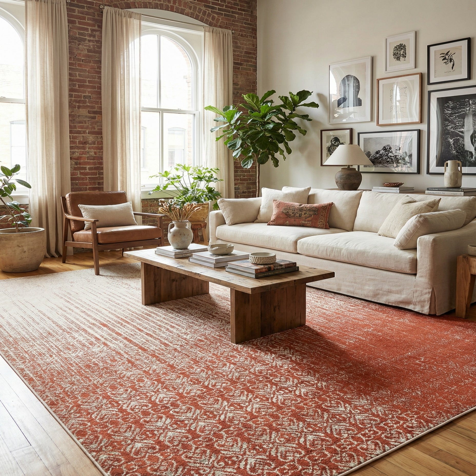 This piece is stain-resistant and shed-free, making it both practical and stylish. Its versatile color scheme and design make it suitable for a variety of interior spaces including but not limited to living rooms, dining areas, and large open spaces. The distinct pattern lends itself well to both contemporary and classic decor, offering a warm and inviting ambiance.