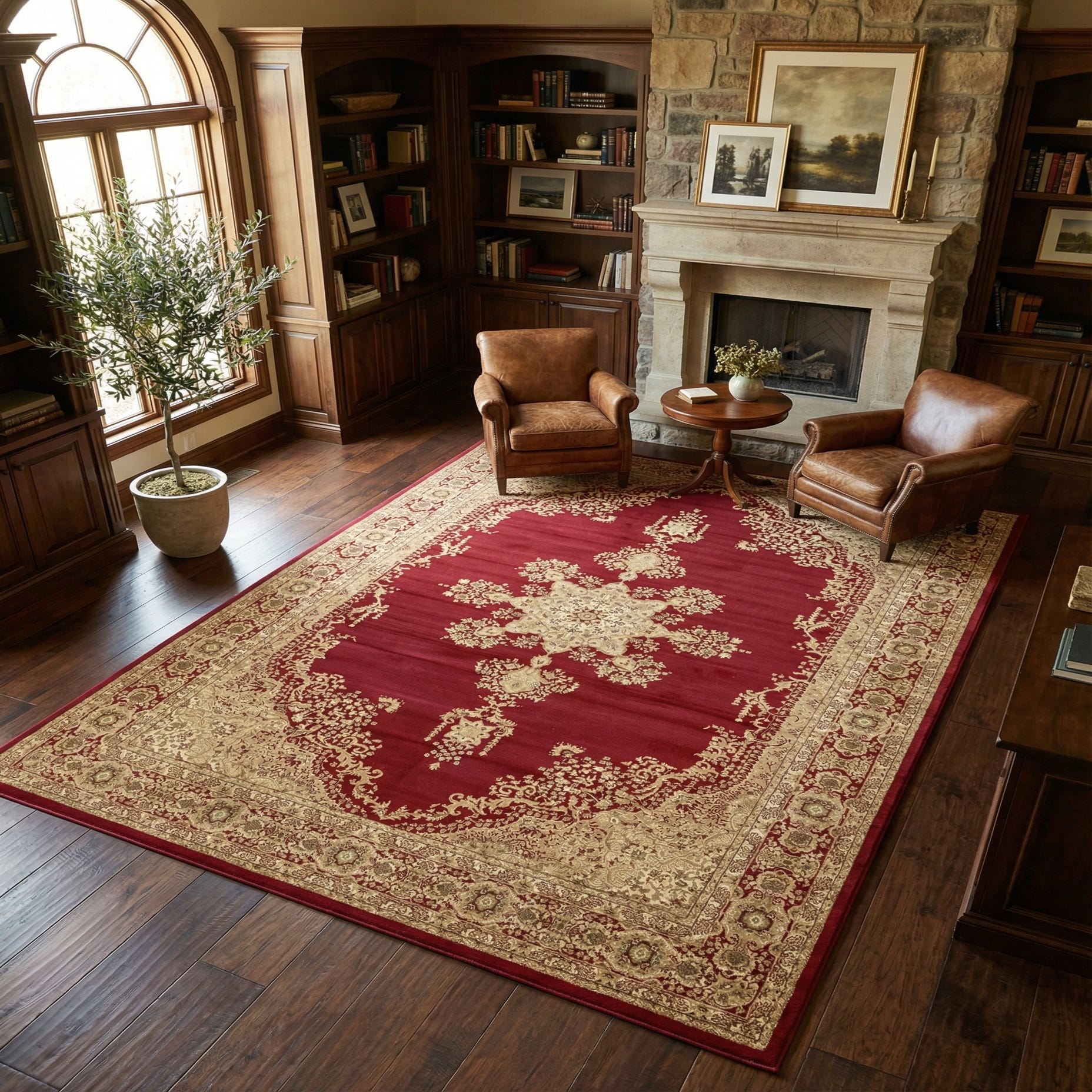 This rug fits well as the focal point of a formal living room or dining area, or to add traditional character to a home office or entry. Pair it with warm wood tones, cream or tan upholstery and metal accents to echo the rug’s palette, or balance the pattern with solid, textured fabrics for a layered look. Its measured pattern and rich color make it especially effective in spaces that benefit from a clear visual anchor.