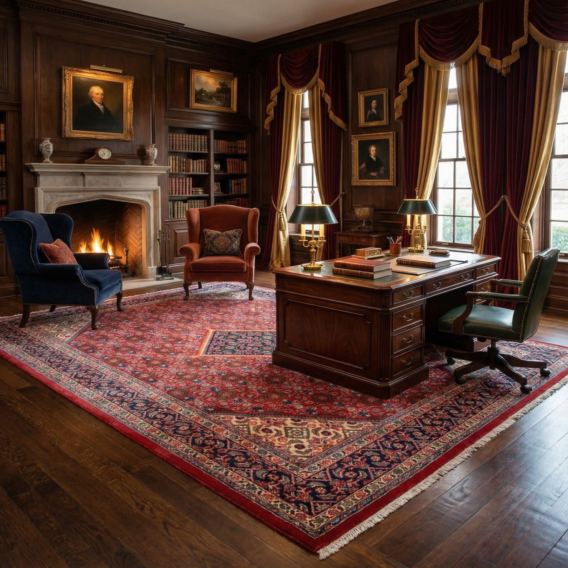 The rug's classic styling and deep, warm colors make it well-suited for traditional interiors, though it can also serve as a sophisticated anchor in transitional spaces where it can bridge modern simplicity with classical elegance. It would resonate particularly well in a formal living room, a stately dining area, or within a library where its historical character would be appreciated. The Farahan rug's texture and pattern offer a touch of grandeur and a well-traveled sophistication to any environment it graces.