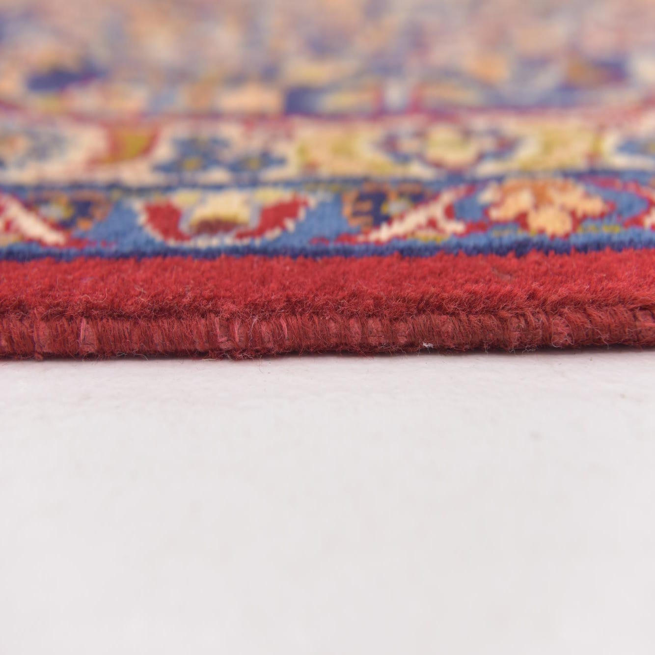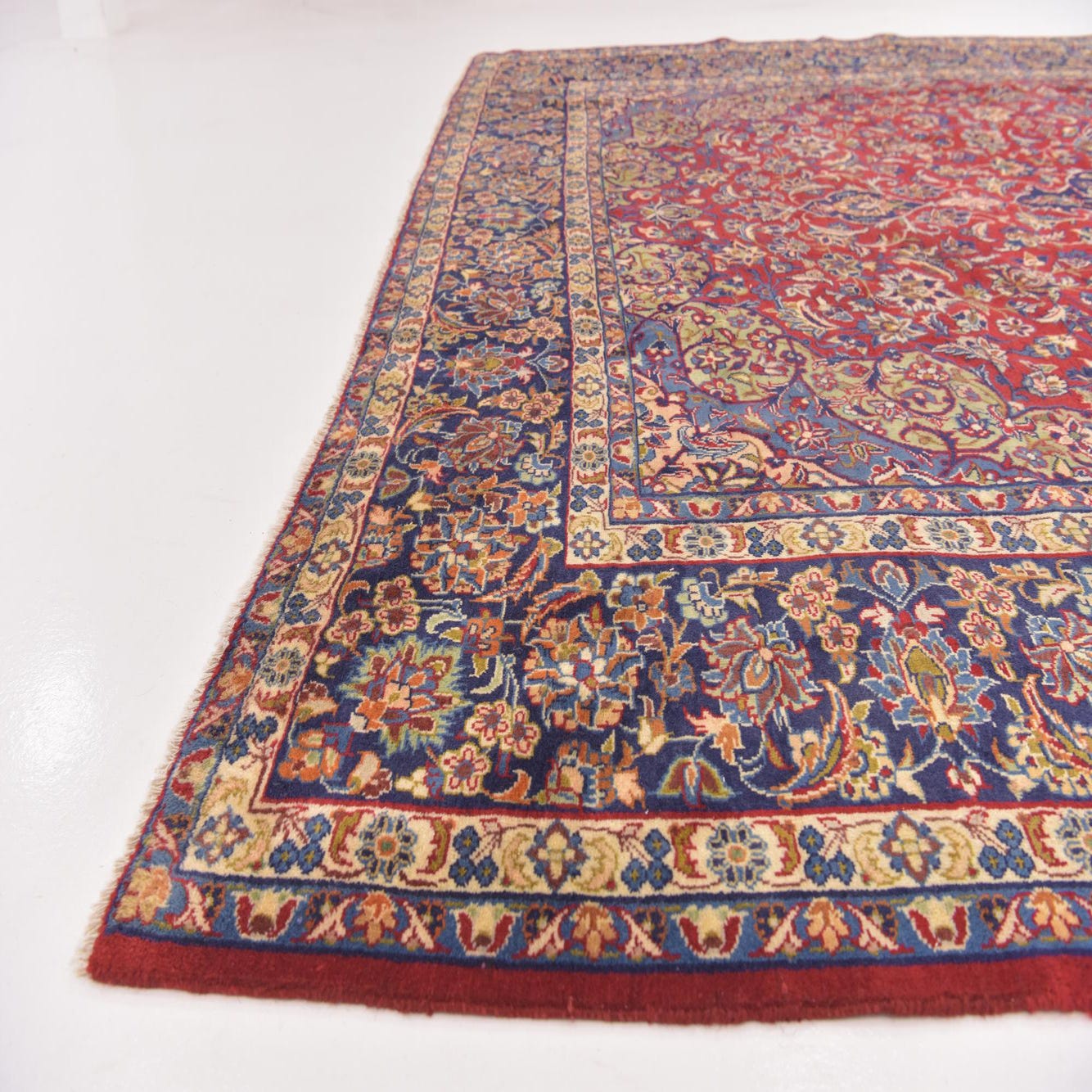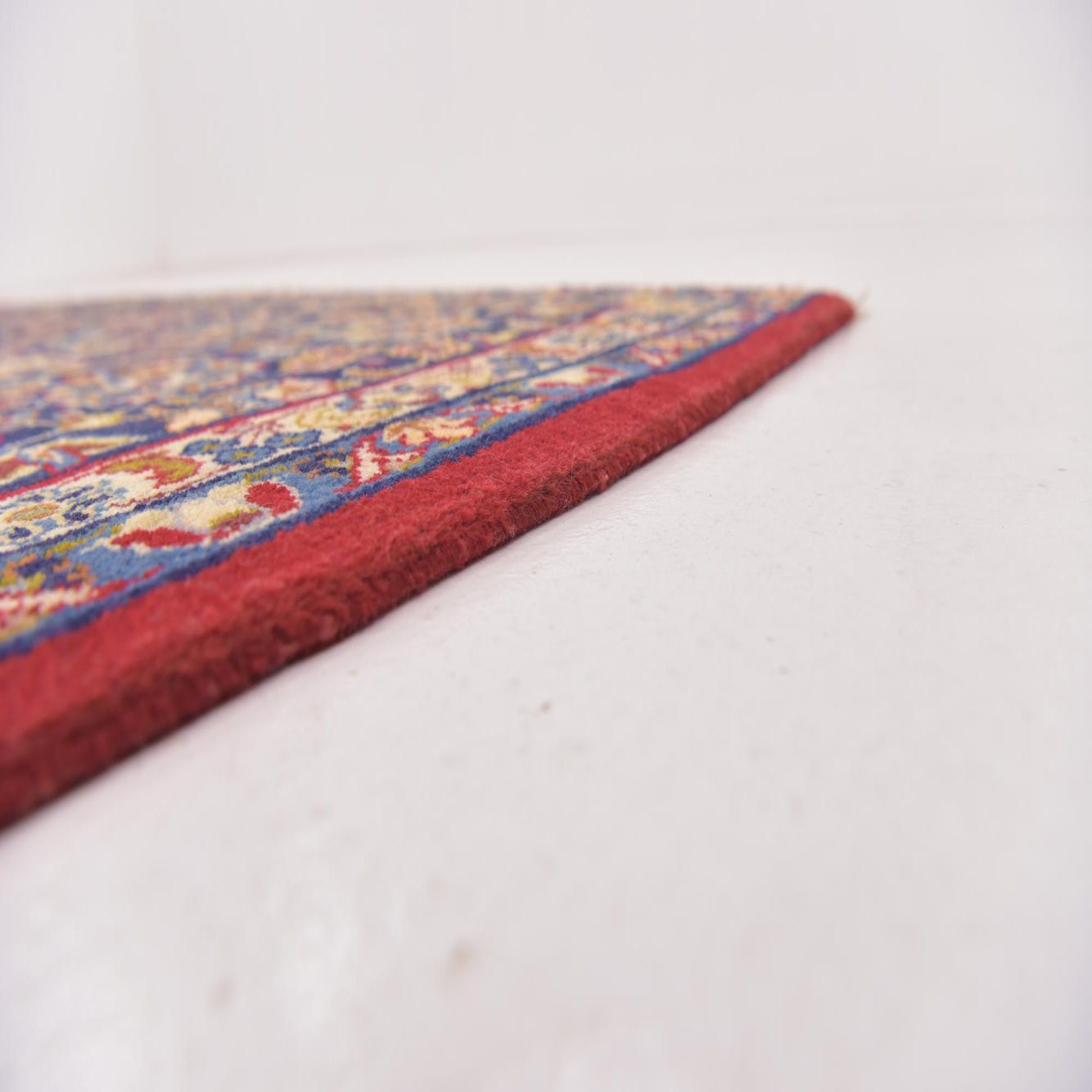 The Isfahan 10x13 rug is a testament to the enduring art of hand-knotted wool craftsmanship. Its rich red background sets the stage for an intricate array of floral motifs in a harmonious palette including blue, light blue, navy blue, ivory, beige, peach, and olive. With a complexity that commands attention, the densely patterned design is framed by a detailed border, reflecting a heritage aesthetic.