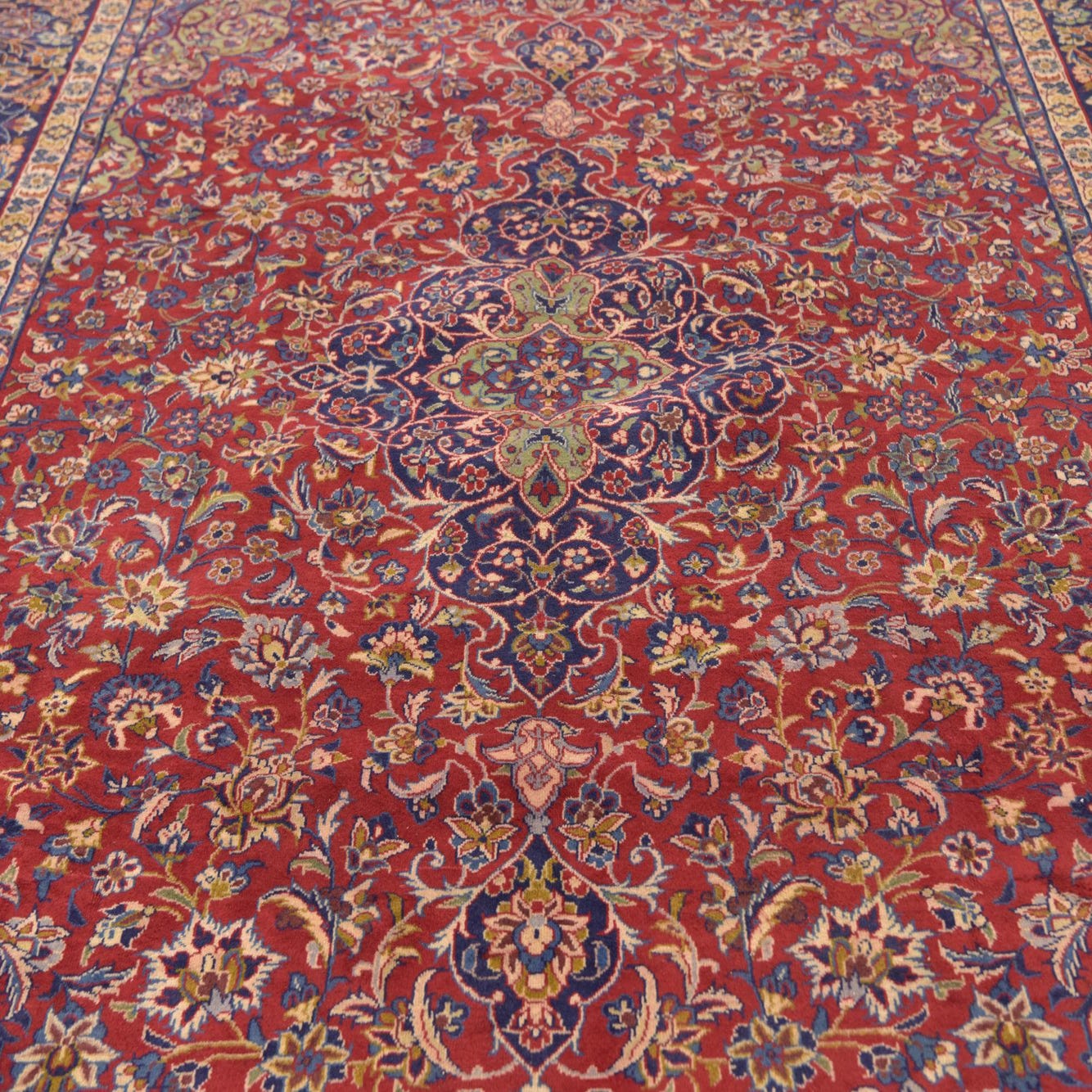 A 10x13 rectangular Isfahan rug featuring a traditional red field with a central medallion and intricate botanical patterns, framed by a dark blue border.