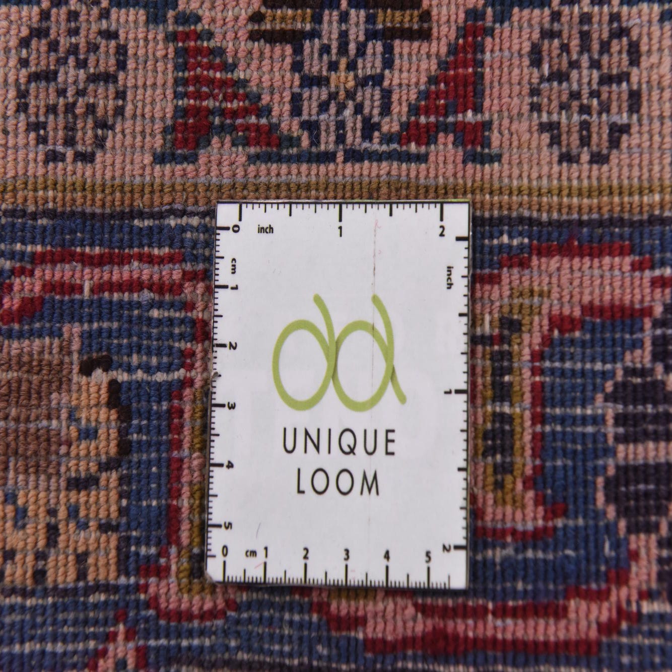 Primary color is Red. Colors in this rug include: Red, Black, Blue, Ivory, Light Blue, Navy Blue, Puce, Salmon, Peach.