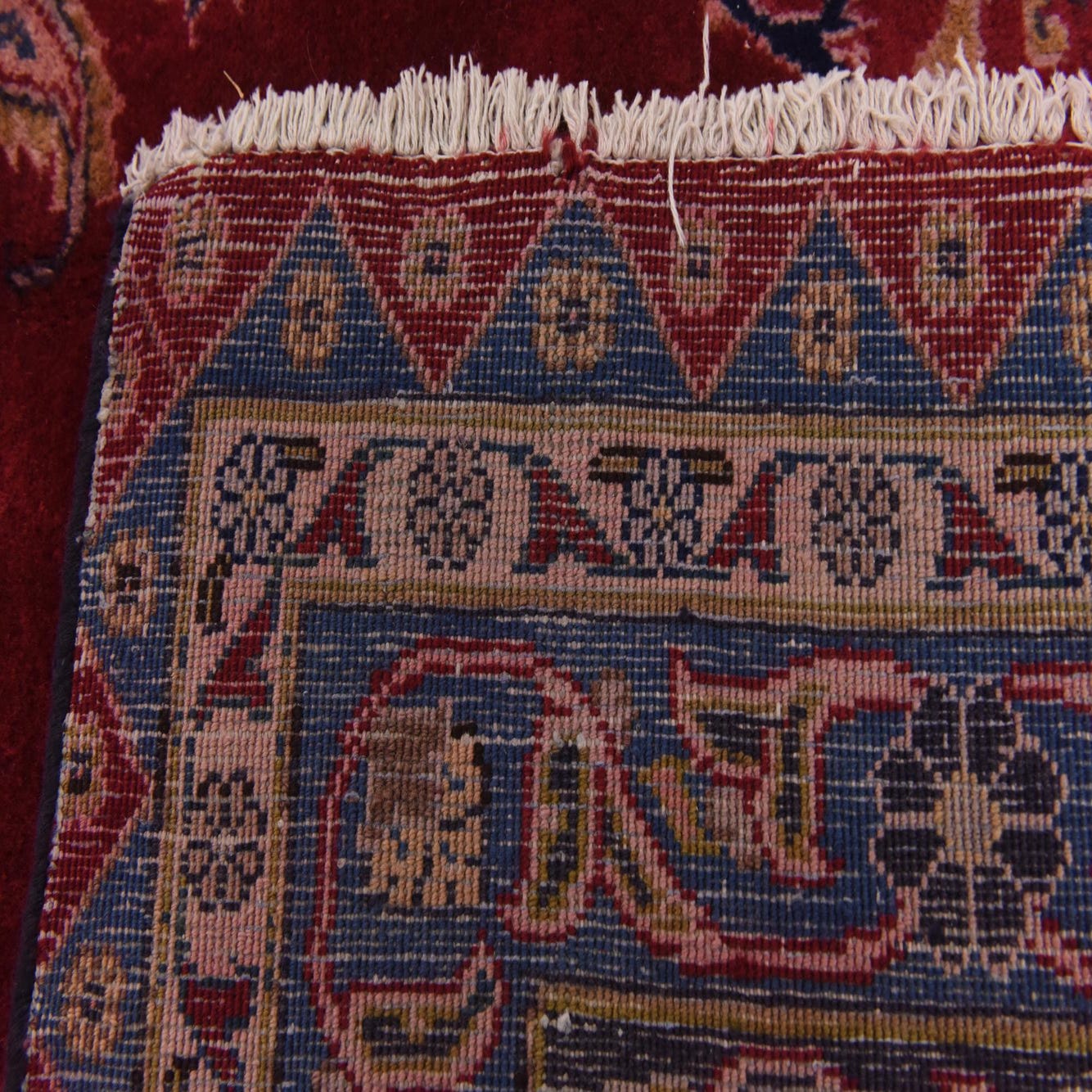 This Isfahan collection rug is hand-knotted with 100% wool, offering durability alongside its elegant design. Sized at 10x13, this piece is a remarkable addition to spacious rooms seeking a touch of character. The rug's rich red background is complemented by a symphony of colors, including black, blue, ivory, light blue, navy blue, puce, salmon, and peach, creating an intricate and harmonious visual experience.