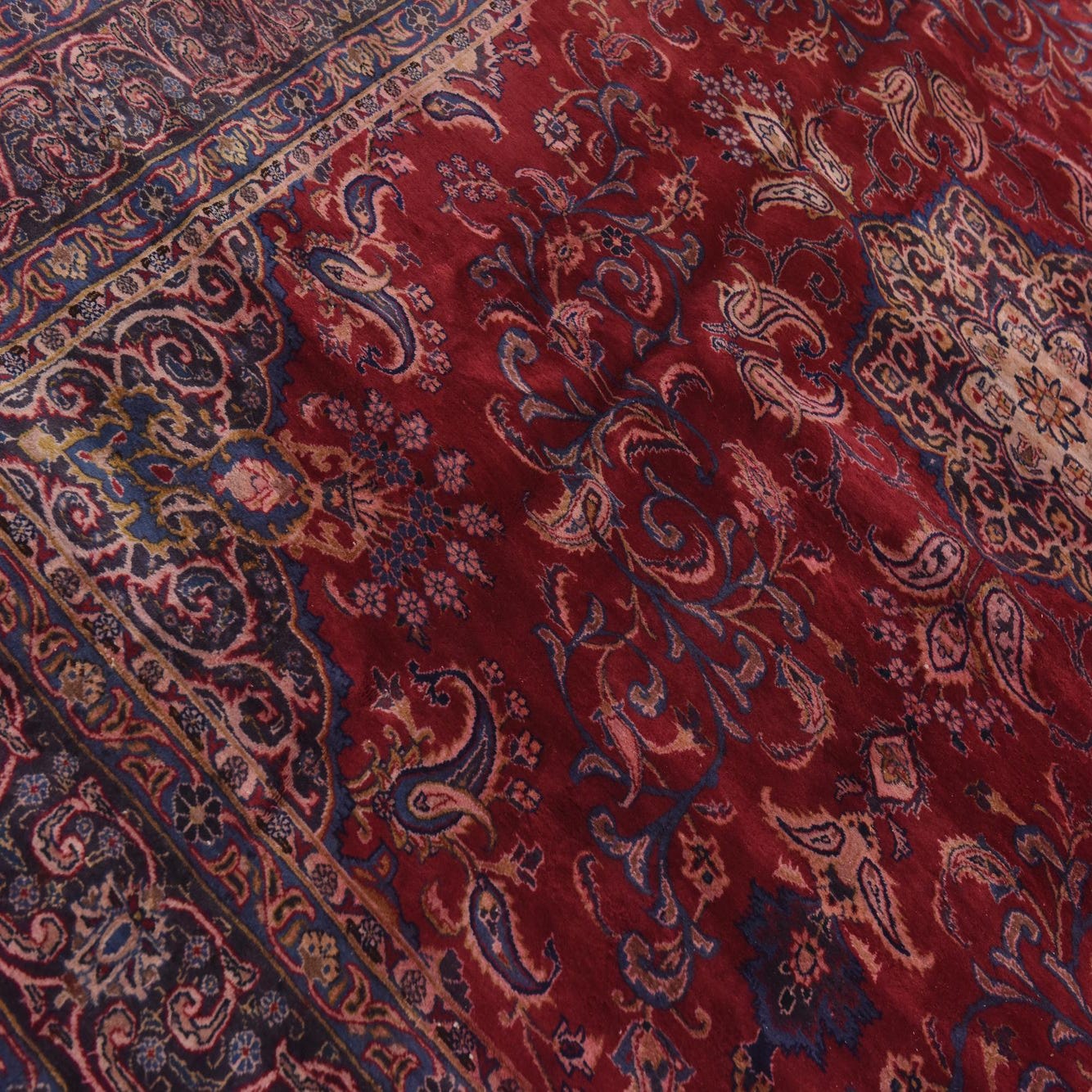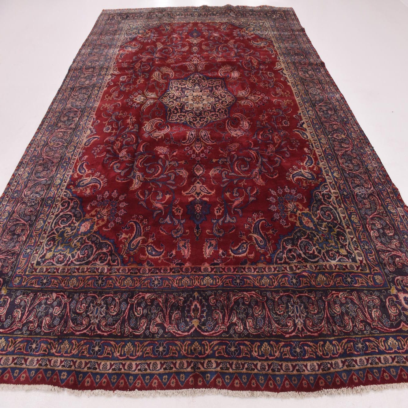 A 10x13 rectangular red Persian rug with a central medallion and intricate botanical patterns in blue, gold, and cream.