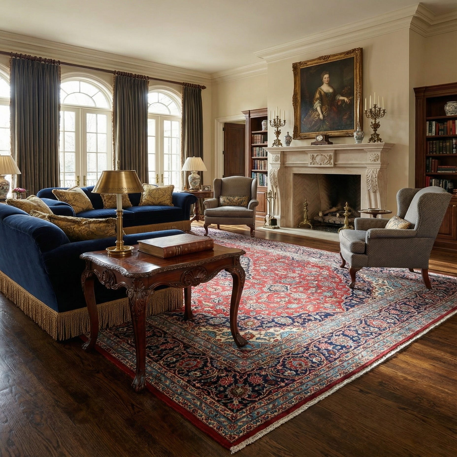 This rug's robust construction and patinated charm would effortlessly complement a variety of interior design settings, from a traditional study or living room to an eclectic dining area. Its rich color palette and complex patterns would ideally pair with both wood and leather furnishings, offering a striking contrast to modern minimalist interiors or enhancing the warmth of a more classic décor. The Kashan rug's grand size makes it an ideal anchor for spacious rooms, imbuing them with a sense of history and depth.