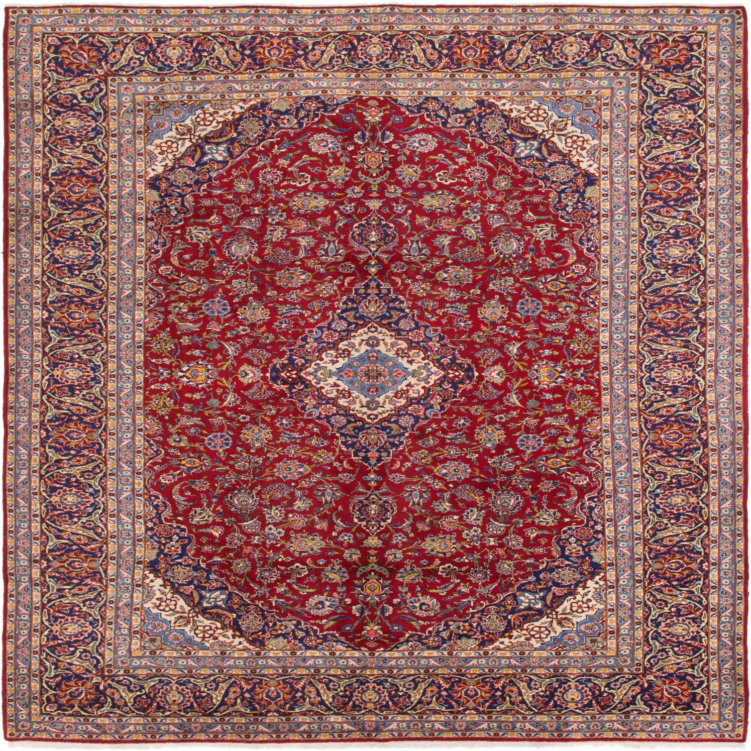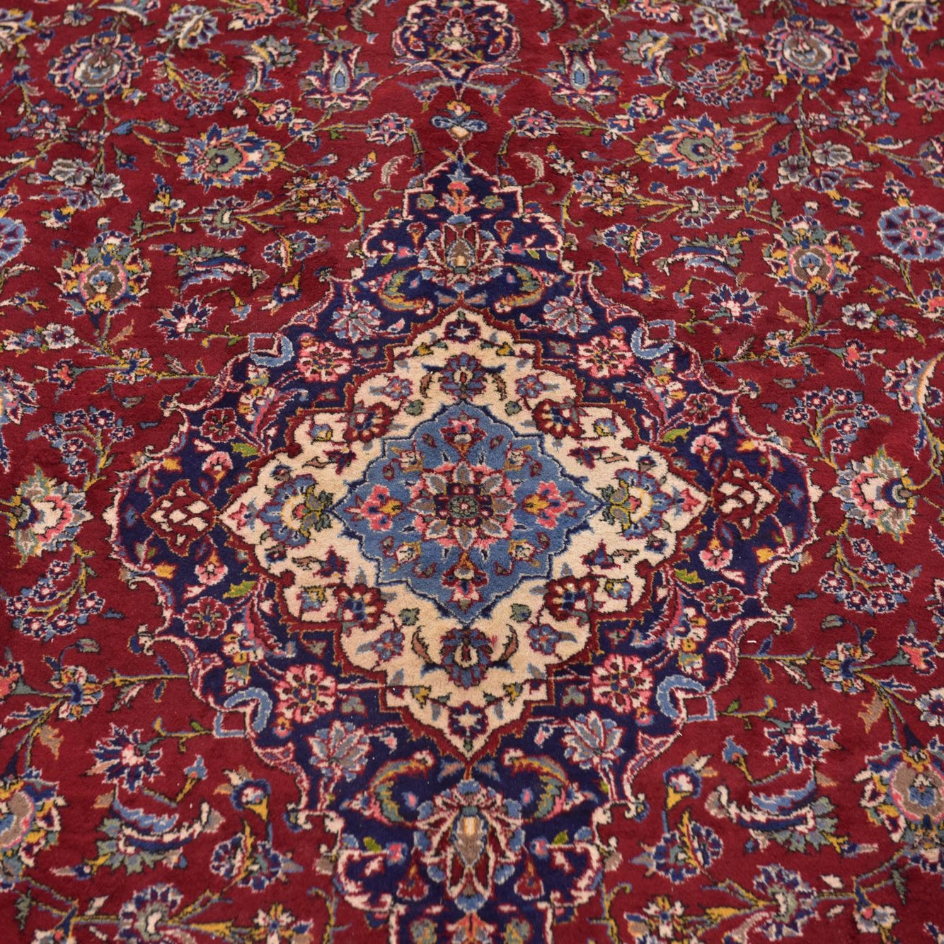 A Persian-inspired medallion anchors an intricate floral field on a warm red background, where scrolling vines and palmettes weave a layered pattern across the surface. The central medallion and surrounding corner spandrels pick up ivory and navy blue accents, while secondary motifs introduce shades of blue, beige, green, light green and salmon for depth and contrast. Hand knotted of 100% wool, the pile has a pleasantly soft, slightly springy hand and a tight weave that renders the detailed motifs with crisp clarity and subtle sheen.