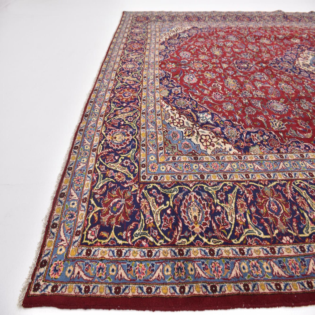 A 10x13 rectangular red wool rug with a traditional Persian botanical medallion pattern, ideal for a living room.