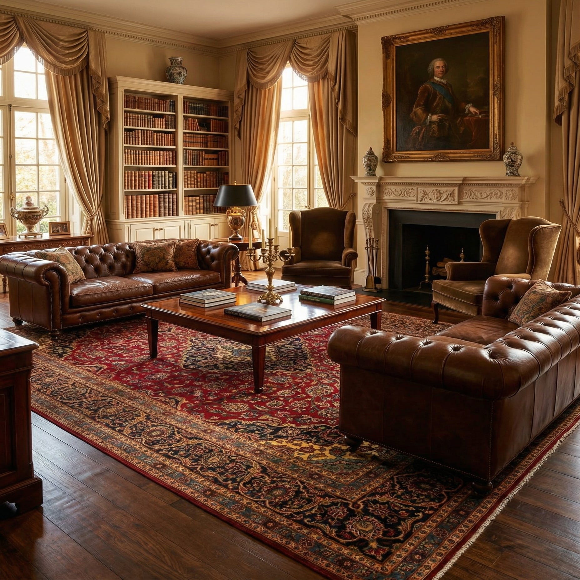 This rug's traditional design and robust colors make it suitable for spaces that aim to project a sense of classic sophistication and comfort. It can seamlessly integrate into grand living rooms, formal dining areas, and spacious offices. The rug's character would complement wood finishes, leather furnishings, and interiors featuring warm tones or brass accents. With its size and visual impact, the rug becomes a focal point, capable of anchoring a room's decor while harmonizing with both antique and contemporary furniture.