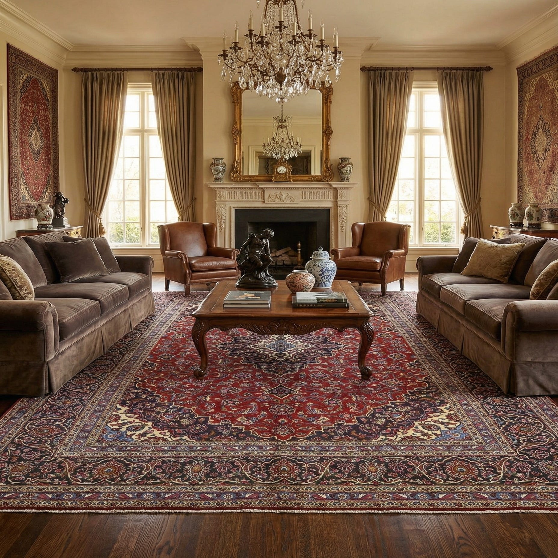 Plays well as the focal anchor in a formal living room beneath a sofa grouping, under a dining table to ground a traditional dining set, or in a study or entry where rich color and pattern set the tone. Pairs naturally with warm wood furniture, leather seating or neutral linen upholstery; accent with navy or cream textiles to echo the rug’s palette, or mix with brass lighting and muted walls for a balanced, layered interior.