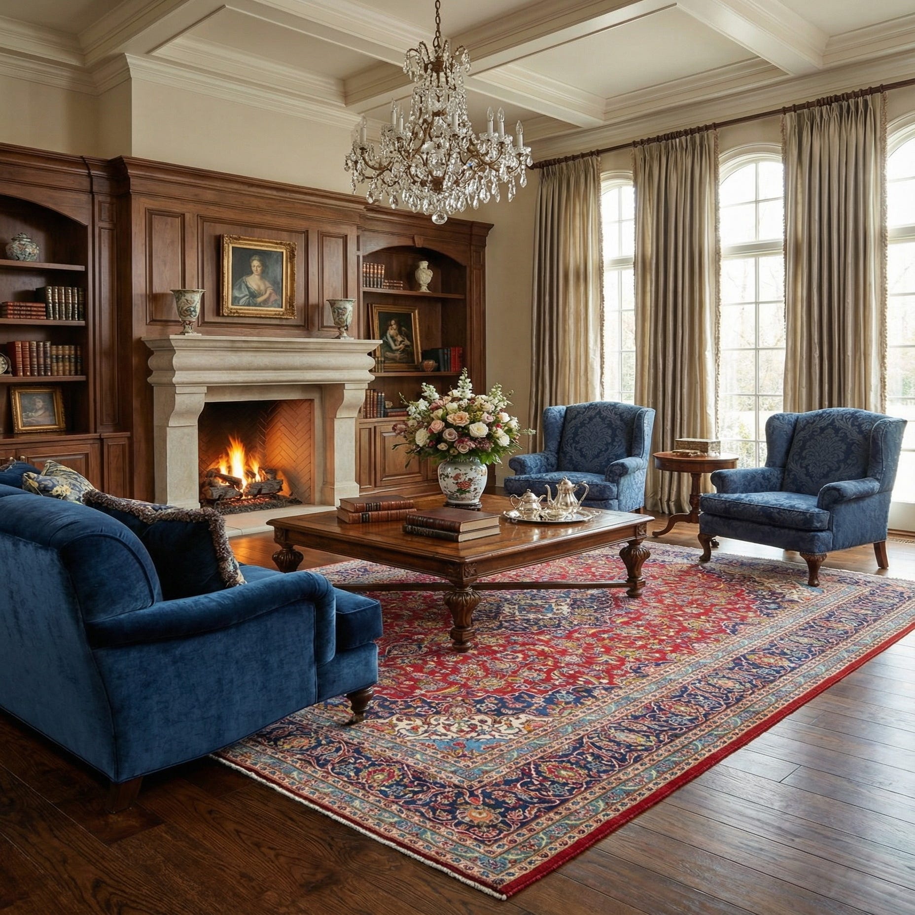 This rug would complement interiors that favor classic elements, such as rooms with rich wooden furnishings or spaces showcasing antiques. Ideal for a formal dining room, grand living space, or a spacious foyer, it offers an anchor of craftsmanship and heritage that could easily become a centerpiece in such settings. The generous dimensions make it suitable for larger areas, where it can unroll its full visual impact.