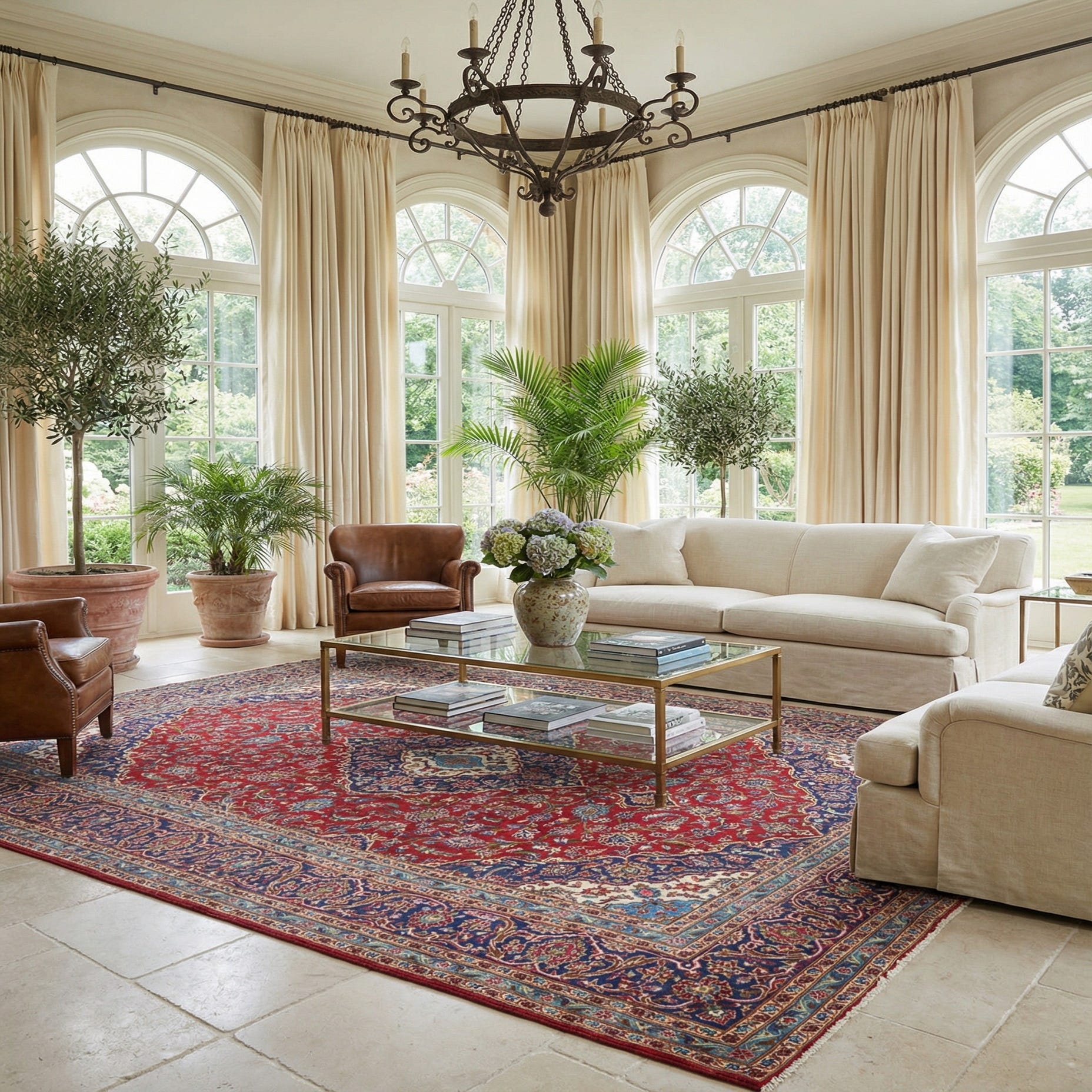 A 10x13 rectangular Kashan Persian rug in rich red with intricate botanical and medallion patterns, framed by a dark blue border.