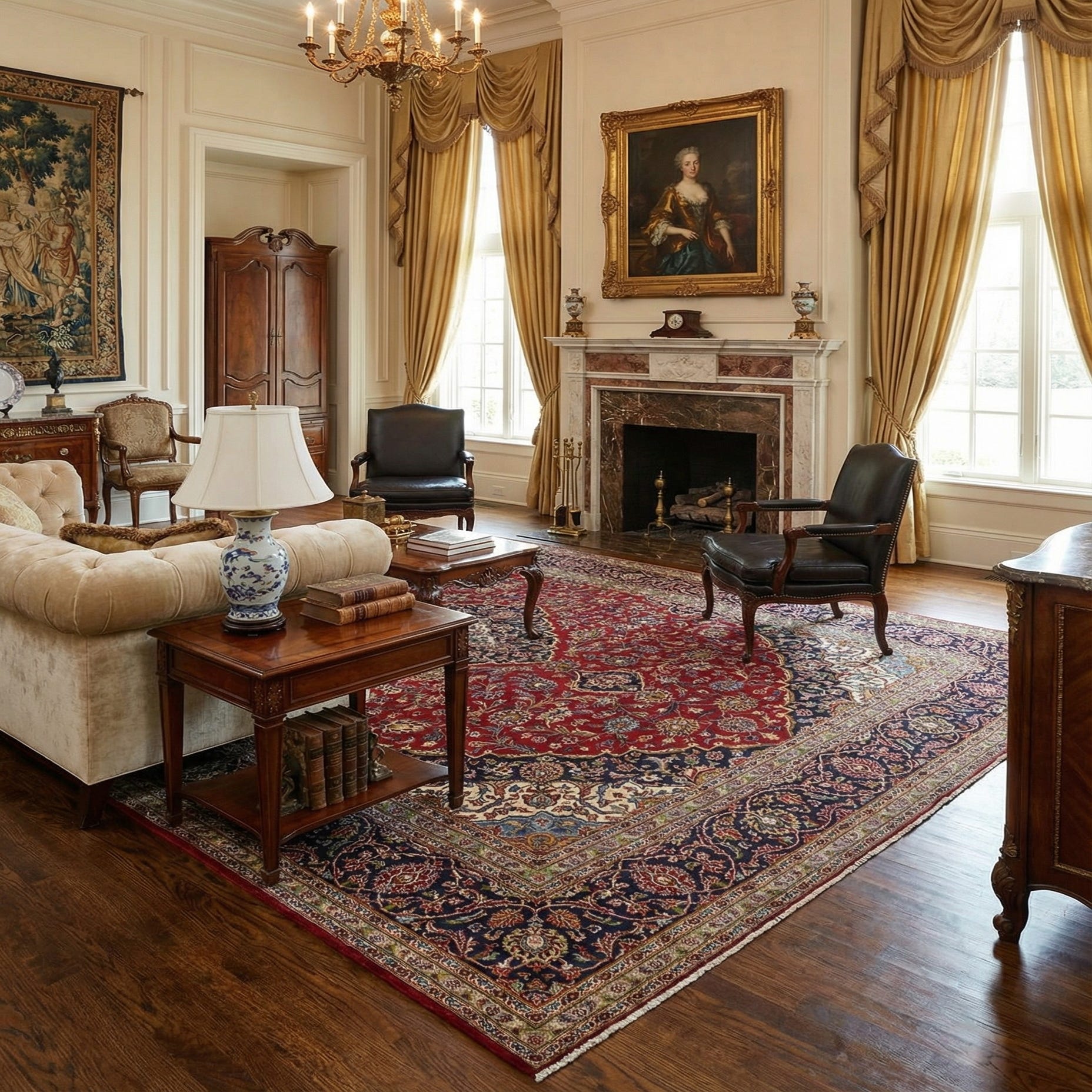 This exquisite rug would be well-suited for a living room, dining area, or a grand entryway, where its size and grandeur can be fully appreciated. It would complement interiors that embrace classic, traditional, or eclectic styles, adding warmth and depth, as well as serving as a stunning focal point in any space.