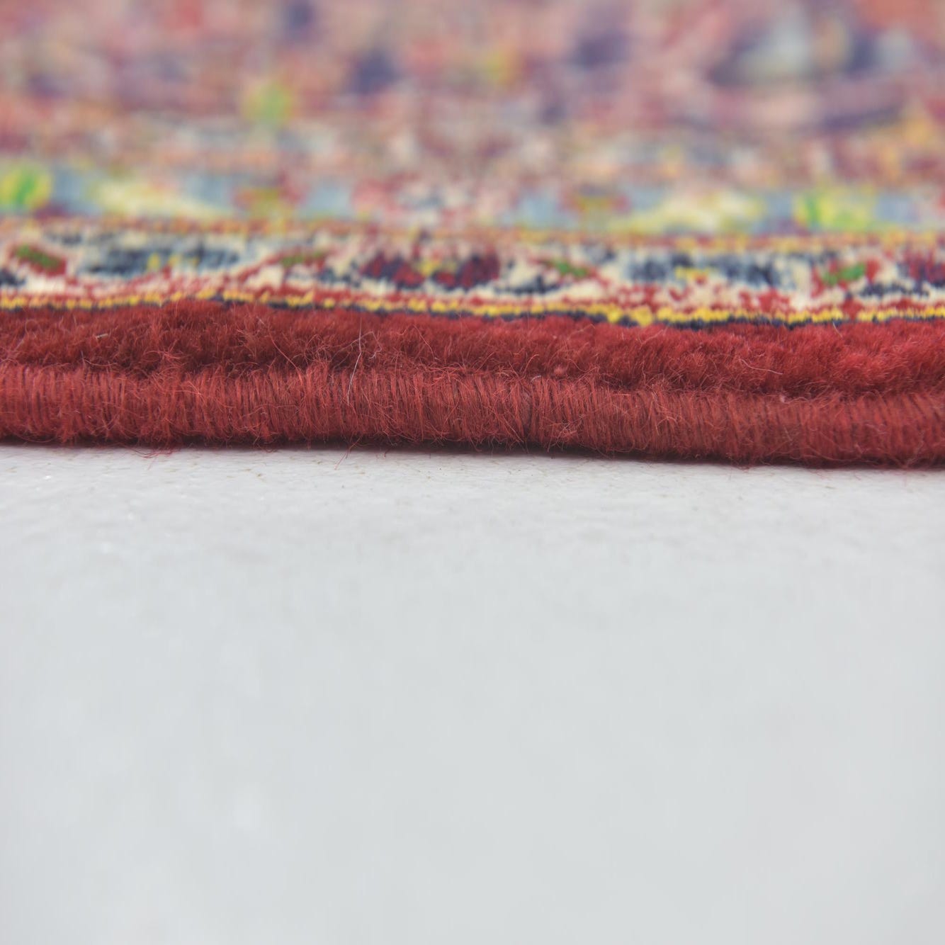 This Kashan collection rug is hand-knotted from 100% wool, offering an authentic feel with a robust texture. Measuring 10x13 feet, it presents a sophisticated design in a rich palette including red as the background color, complemented with intricate patterns in black, blue, burgundy, green, navy blue, pink, salmon, olive, and gold.