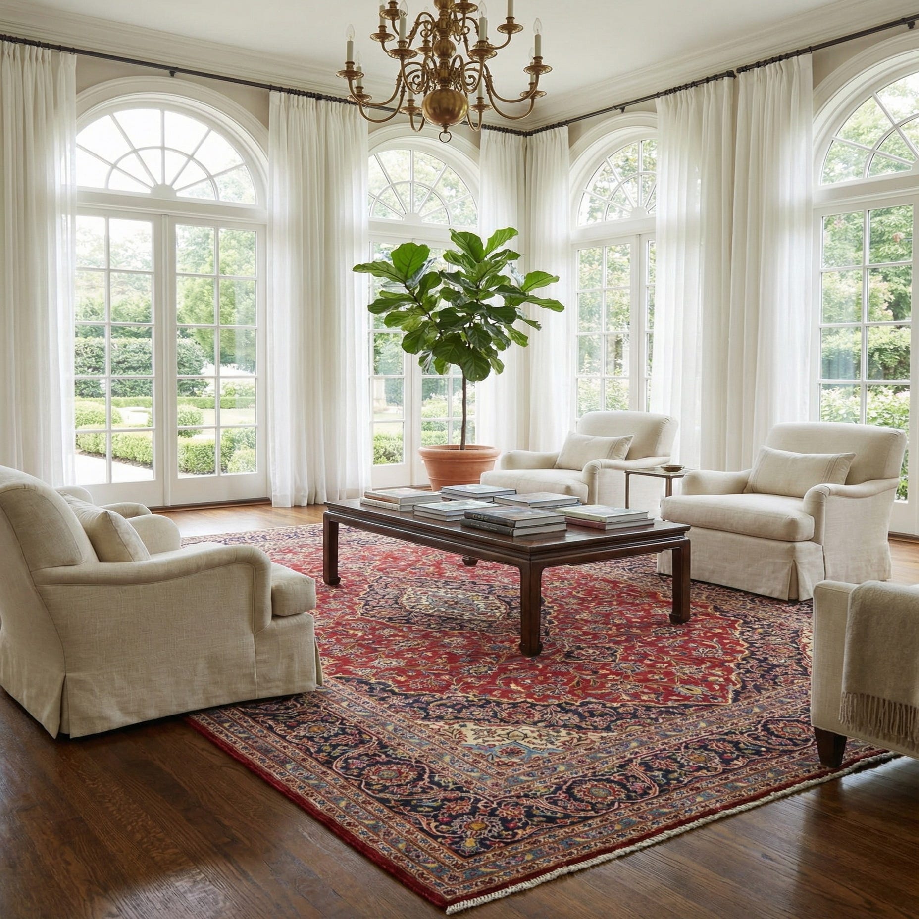 A 10x13 rectangular red Persian rug with a central medallion and intricate botanical patterns in navy, cream, and gold.