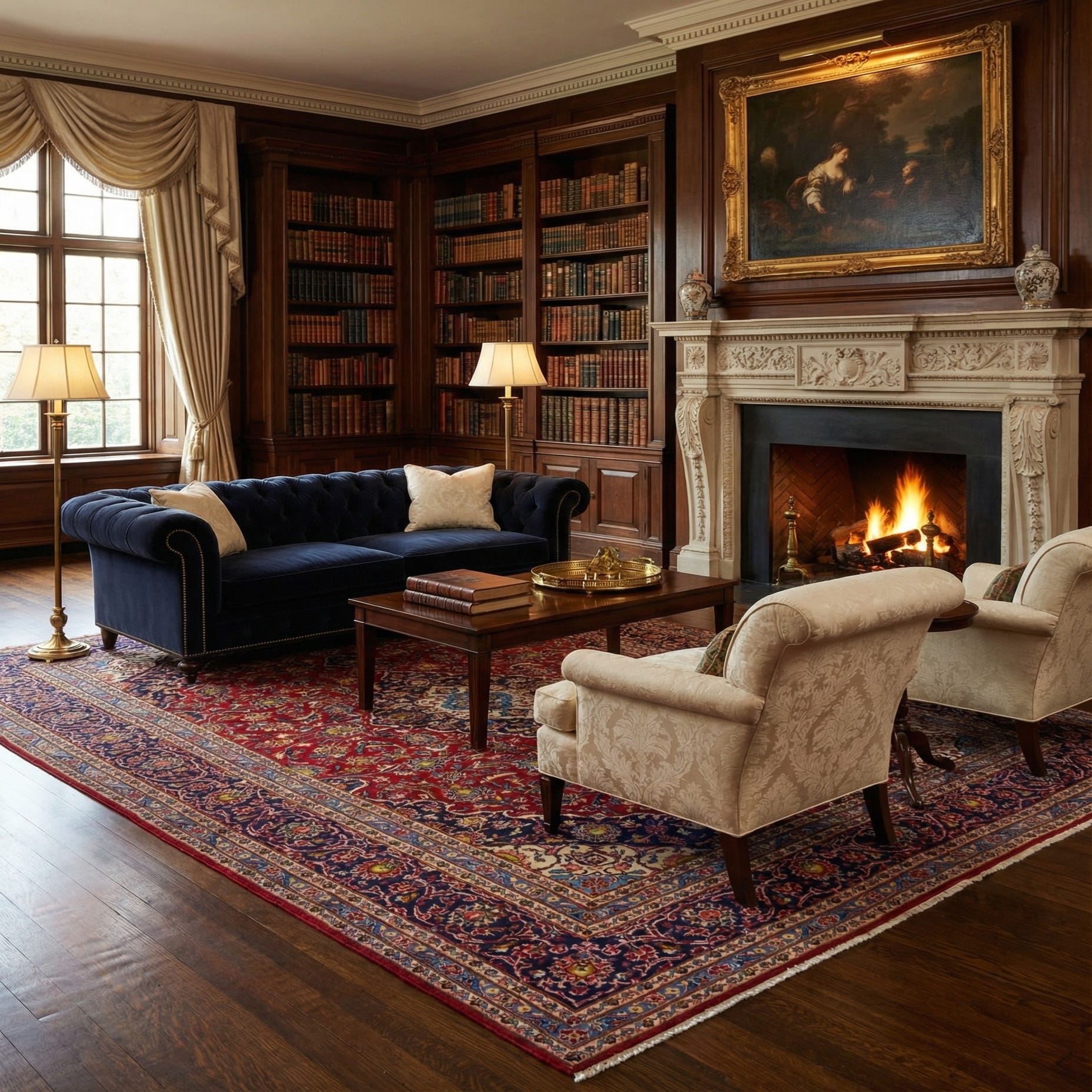 A 10x13 rectangular red Persian wool rug with a central medallion and intricate floral patterns, ideal for a living room.