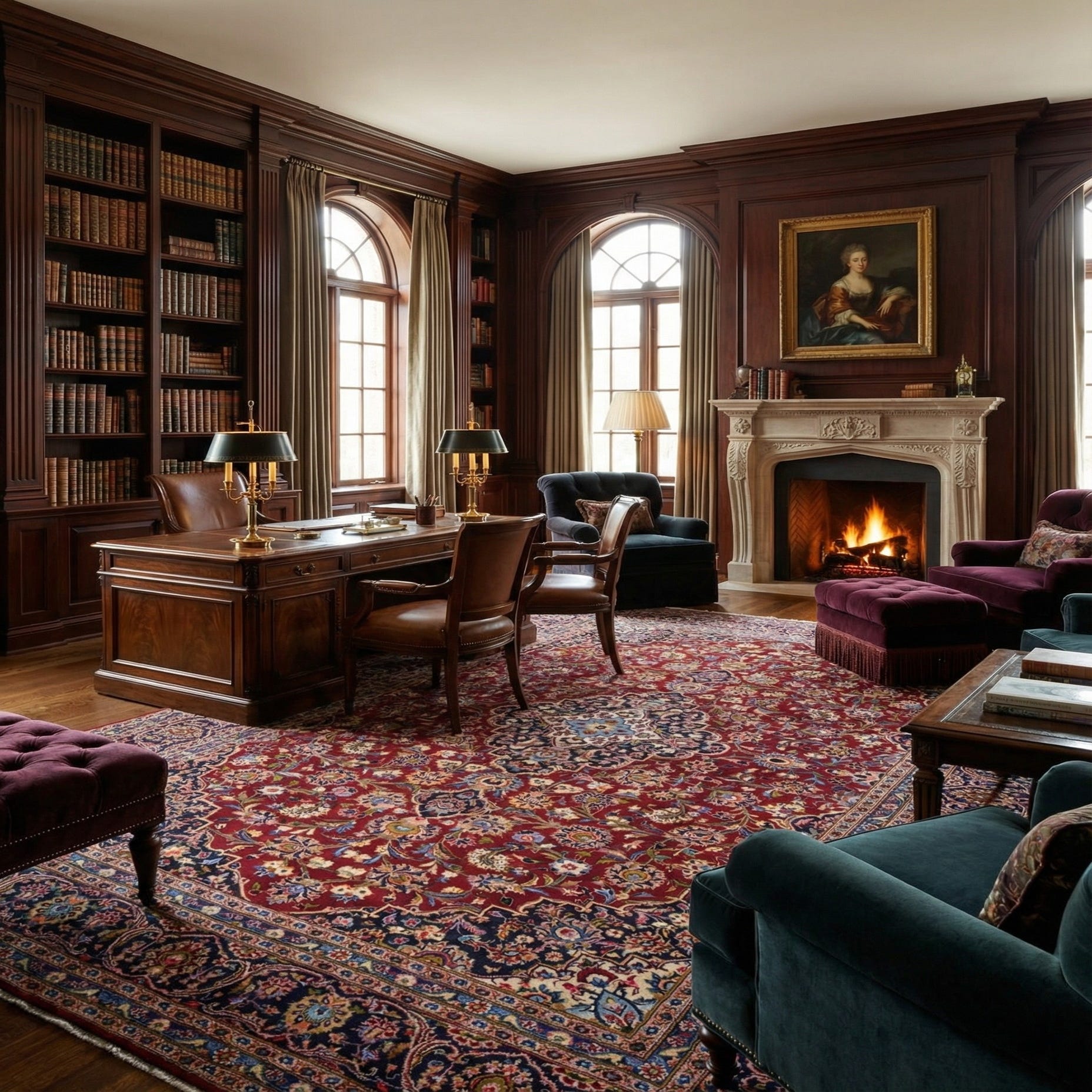 This exceptional piece is well-suited for placement in settings that appreciate the finesse of traditional decor, whether in a formal living room, dining area, or private library. Its robust palette pairs splendidly with rich wooden furnishings, leather accents, and rooms that feature a balance of antique and contemporary accessories. The Kashan rug can anchor a space with a sense of history and grandeur, making it an ideal choice for interiors that seek to blend cultural artistry with everyday luxury.