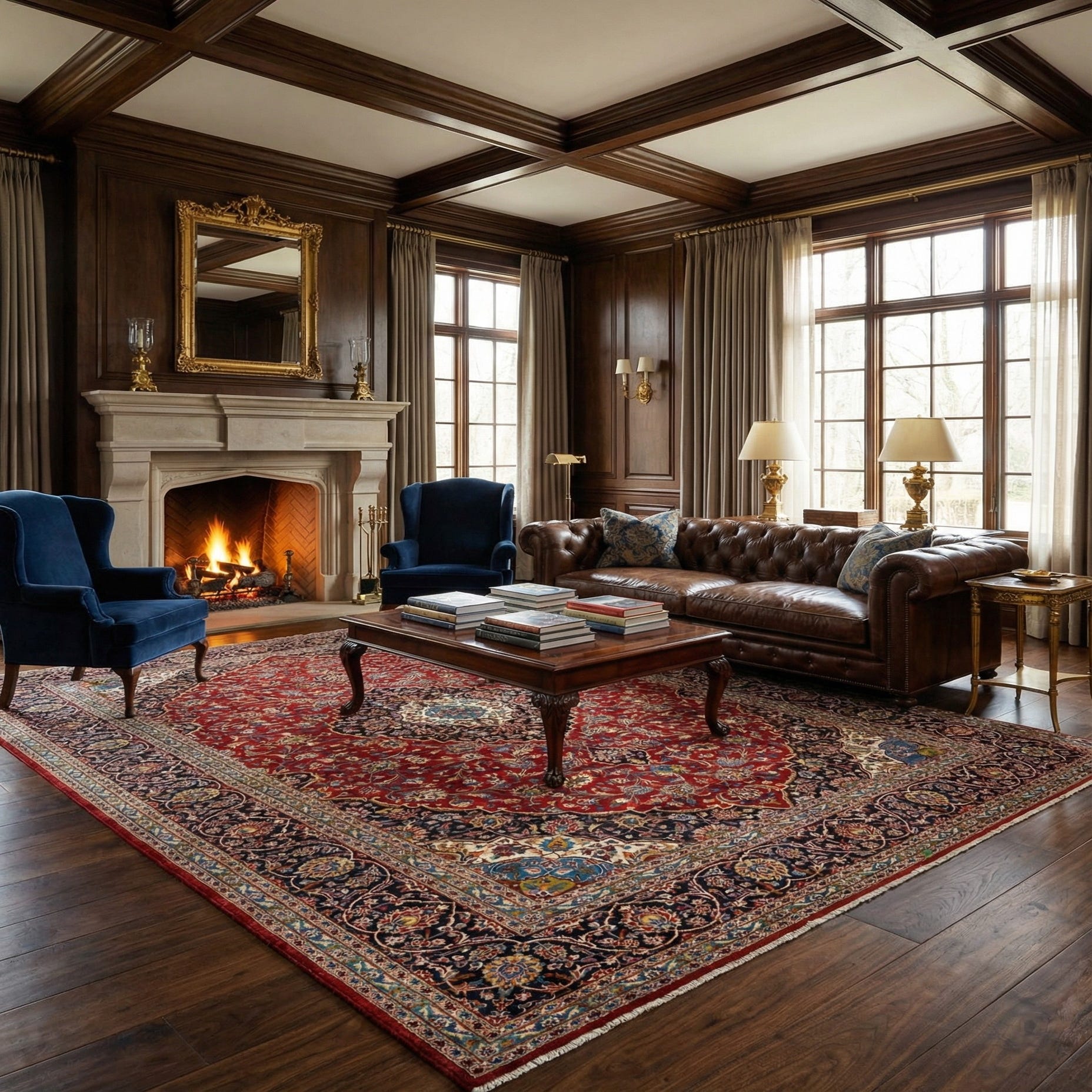 This hand-knotted wool Kashan rug would be a sophisticated addition to an interior that appreciates classic design elements. It can serve as a focal point in a formal living room, dining room, or office, harmonizing particularly well with traditional and transitional decors. The rich palette and elaborate patterns would balance with neutral furnishings and wood tones, allowing it to anchor the space with its substantial size and visual depth.
