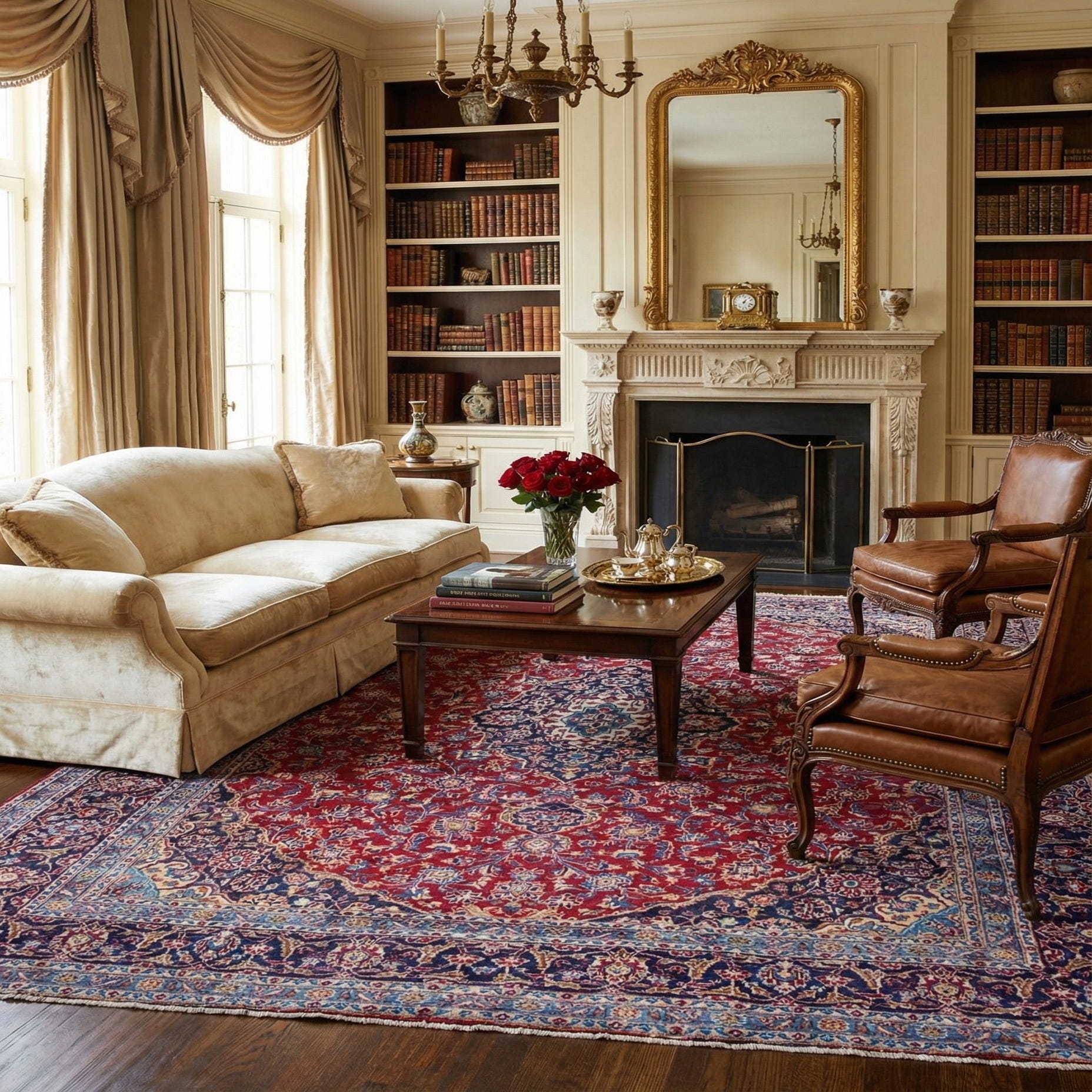 A large 10x13 rectangular Persian rug featuring a central medallion and intricate floral patterns in deep reds and blues.
