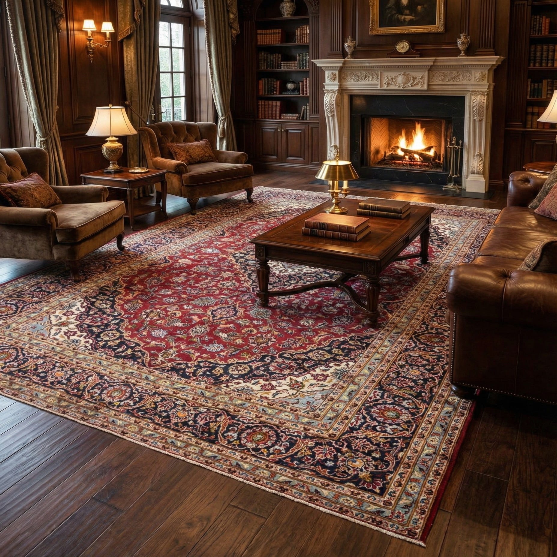 A large 10x13 rectangular Persian rug with a rich red field, intricate botanical patterns, and a central medallion, framed by a dark navy border.