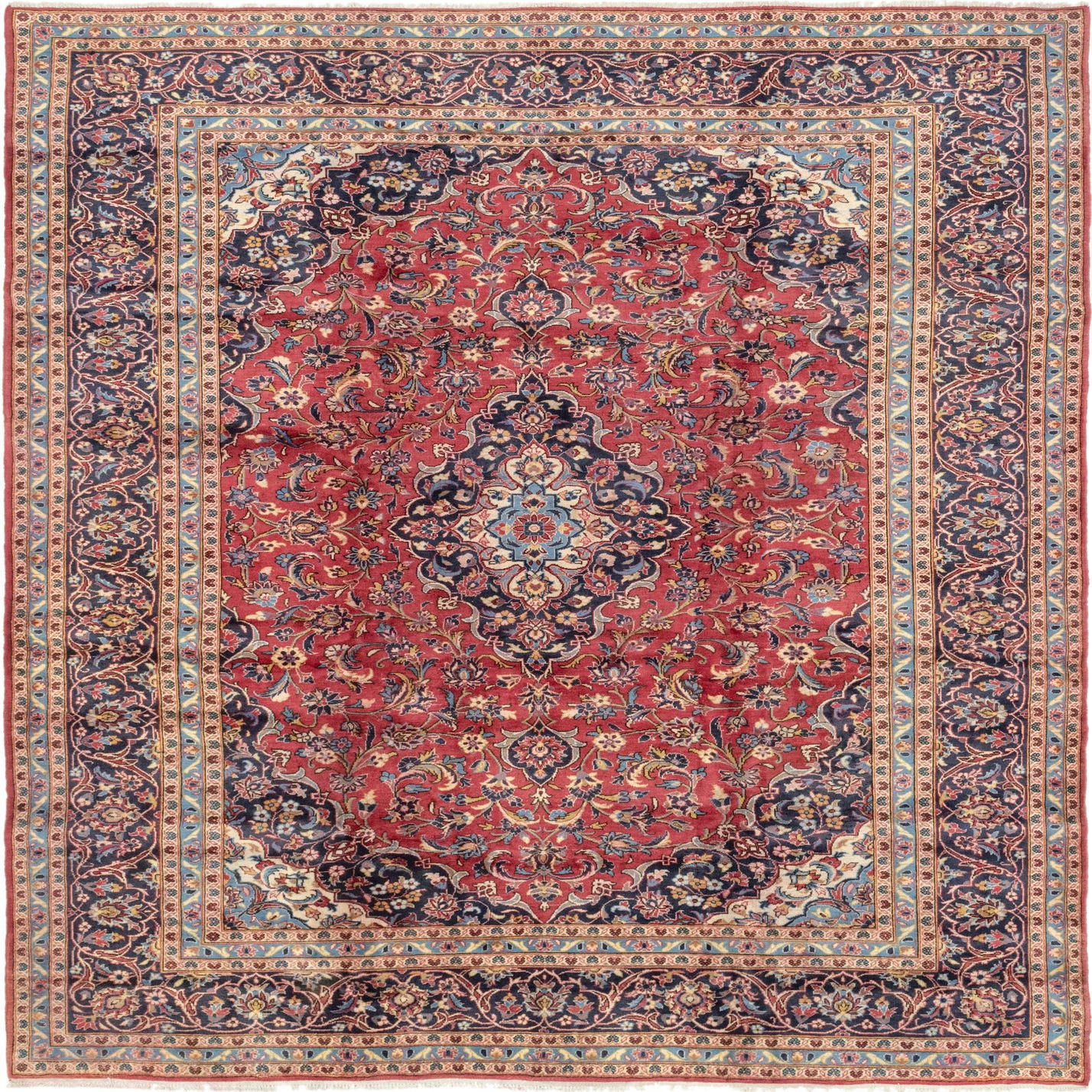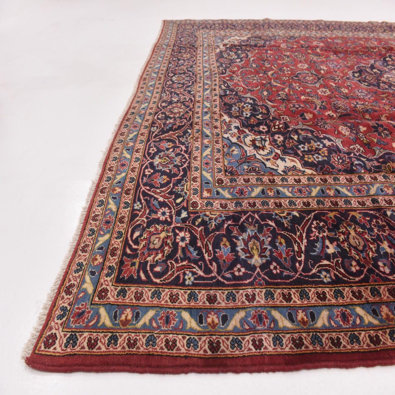 A 10x13 rectangular red Persian wool rug with a central medallion and intricate botanical patterns in navy, blue, and cream.