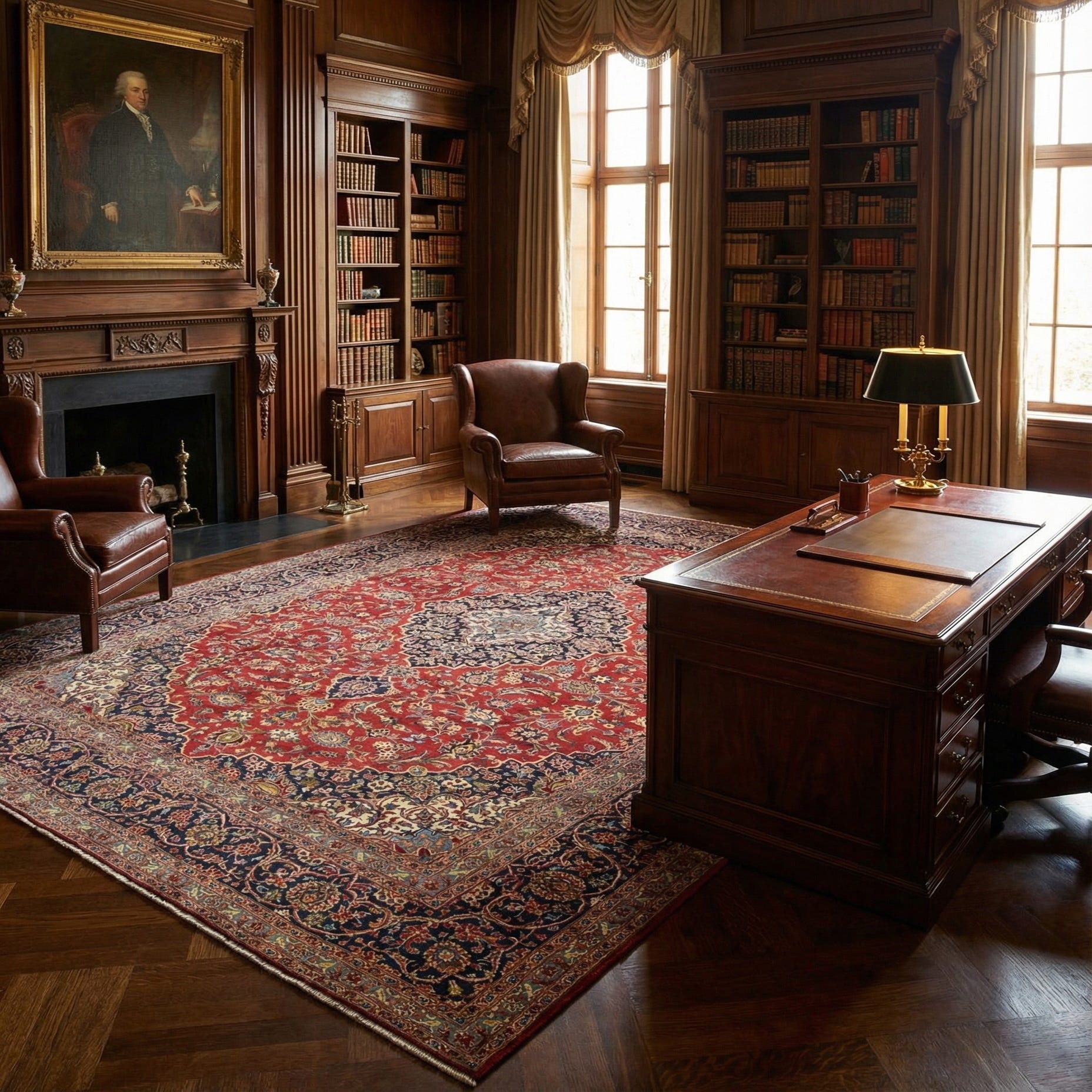 The presence of fringe adds to its authentic charm, further grounding it in its cultural heritage. This rug is well-suited for a classic interior, be it a formal living room or dining area, where it can serve as an anchoring design element. It can also complement a library or office, offering a sense of gravitas and warmth to the decor. For spaces that aim to mix old and new, this rug could provide a traditional touch amidst contemporary furnishings, bridging styles with elegance.