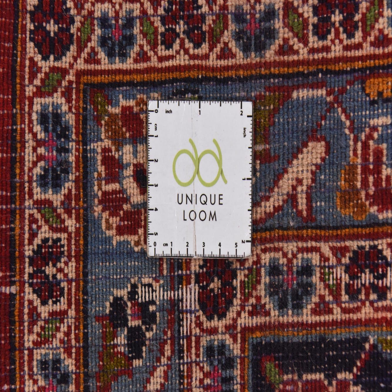 A large 10x13 rectangular red Persian rug with a detailed navy blue border and central medallion pattern.