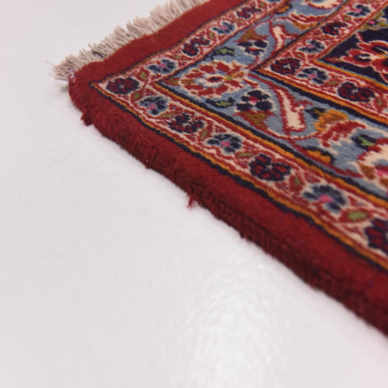 The central medallion design is an emblematic characteristic of the Kashan style, encircled by complex floral and foliate motifs that resonate with traditional elegance. The border complements the central pattern with a detailed repetition of the design, creating a cohesive aesthetic.
