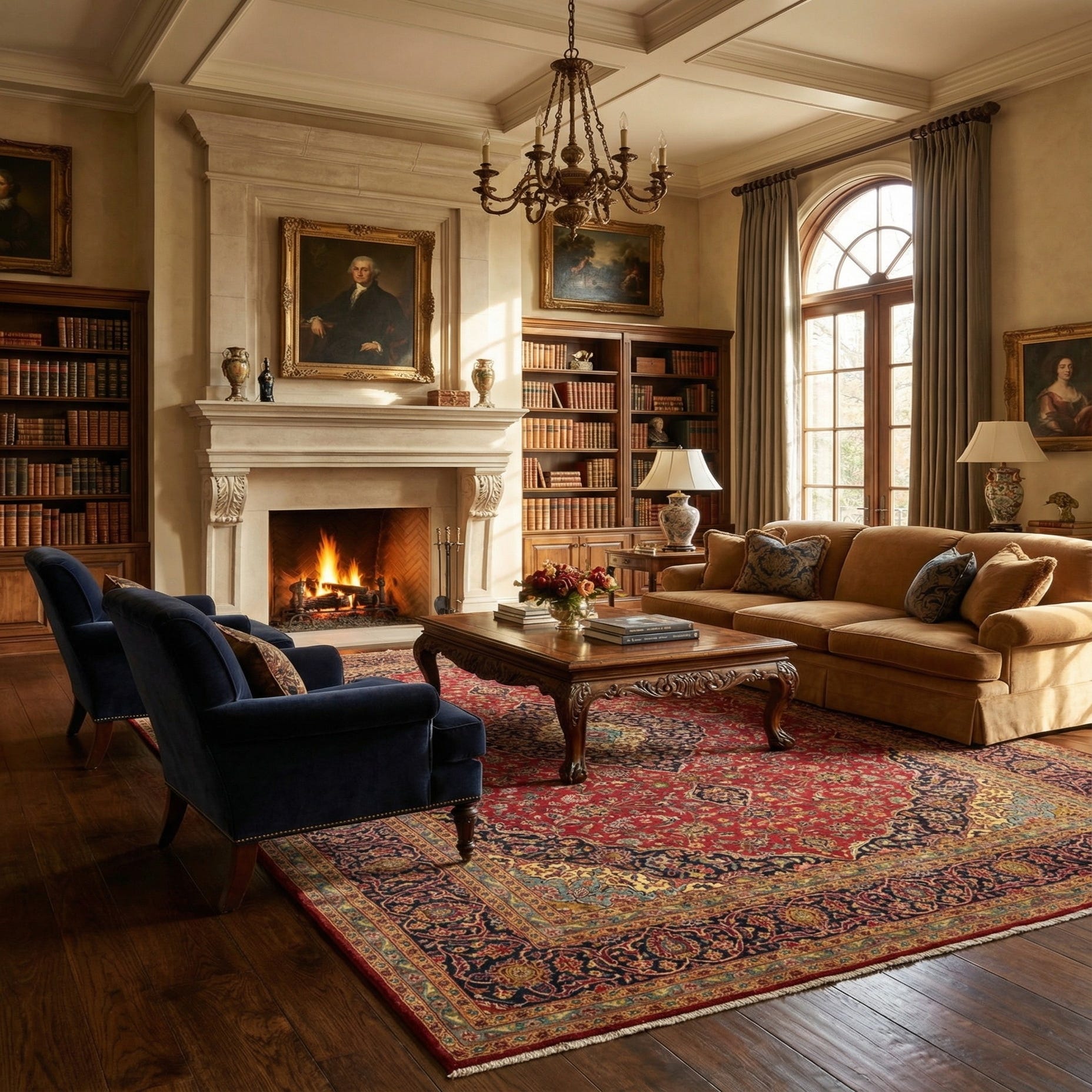 The rug works well as an anchor in formal living or dining rooms where dark woods and brass accents emphasize its classic palette, and it pairs naturally with ivory upholstery or leather seating for a balanced contrast. It also fits comfortably in a study or library to add warmth and pattern to bookshelves and wood tones, or in an eclectic space where its red background and multicolored motifs can tie together varied textiles and layered finishes.