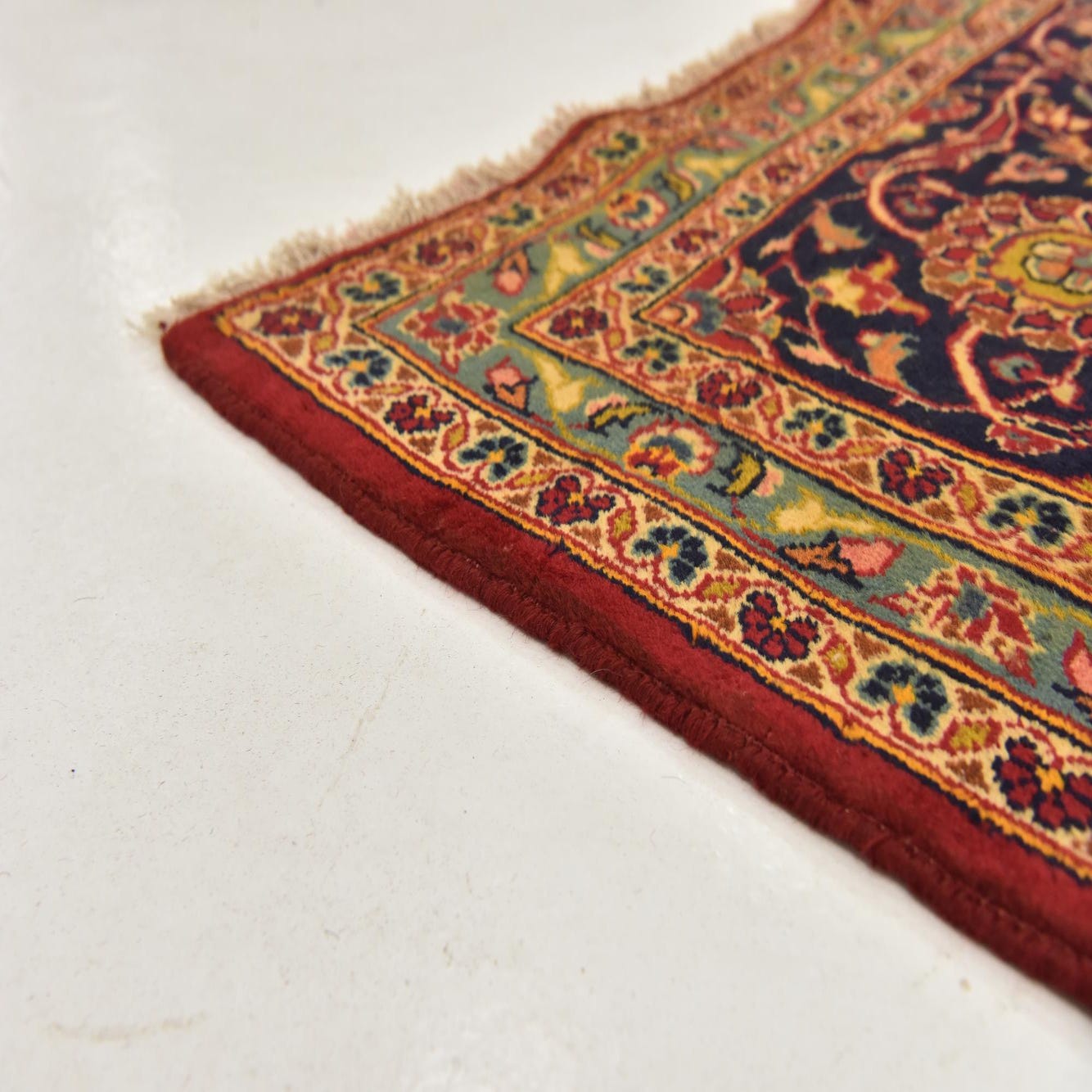 Hand-knotted from 100% wool, this traditional Persian-style medallion rug displays a dense, tactile pile with a soft, slightly lustrous finish. A deep red field provides the backdrop for an ornate central medallion in ivory and beige, while navy and black form the strong, intricate borders. Fine floral vines and scrolling arabesques weave through the field in shades of blue, olive, green, brown and touches of pink, creating a layered, finely detailed pattern that reads both formal and richly textured underfoot.