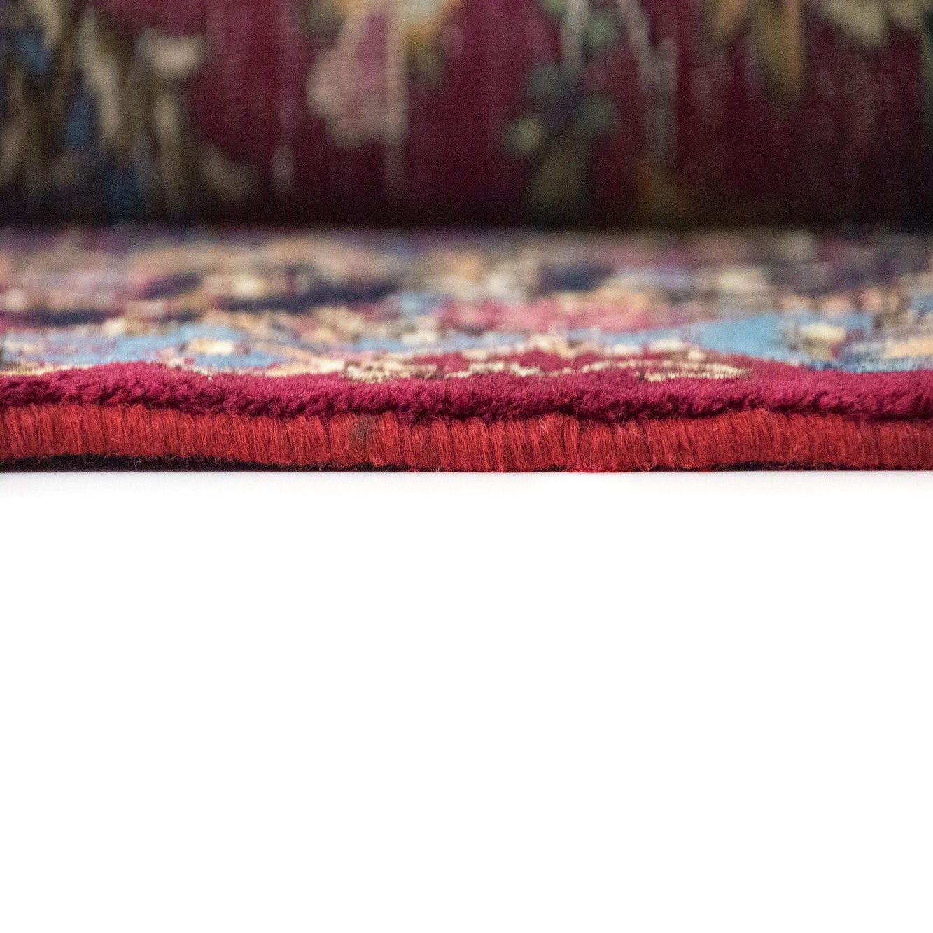 Primary color is Red. Colors in this rug include: Red, Blue, Beige, Pink, Green.