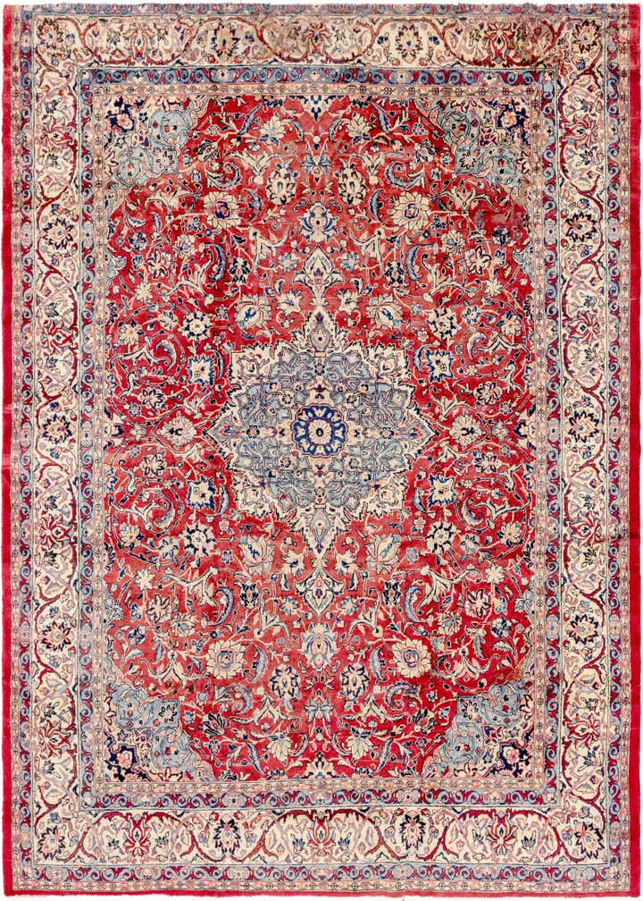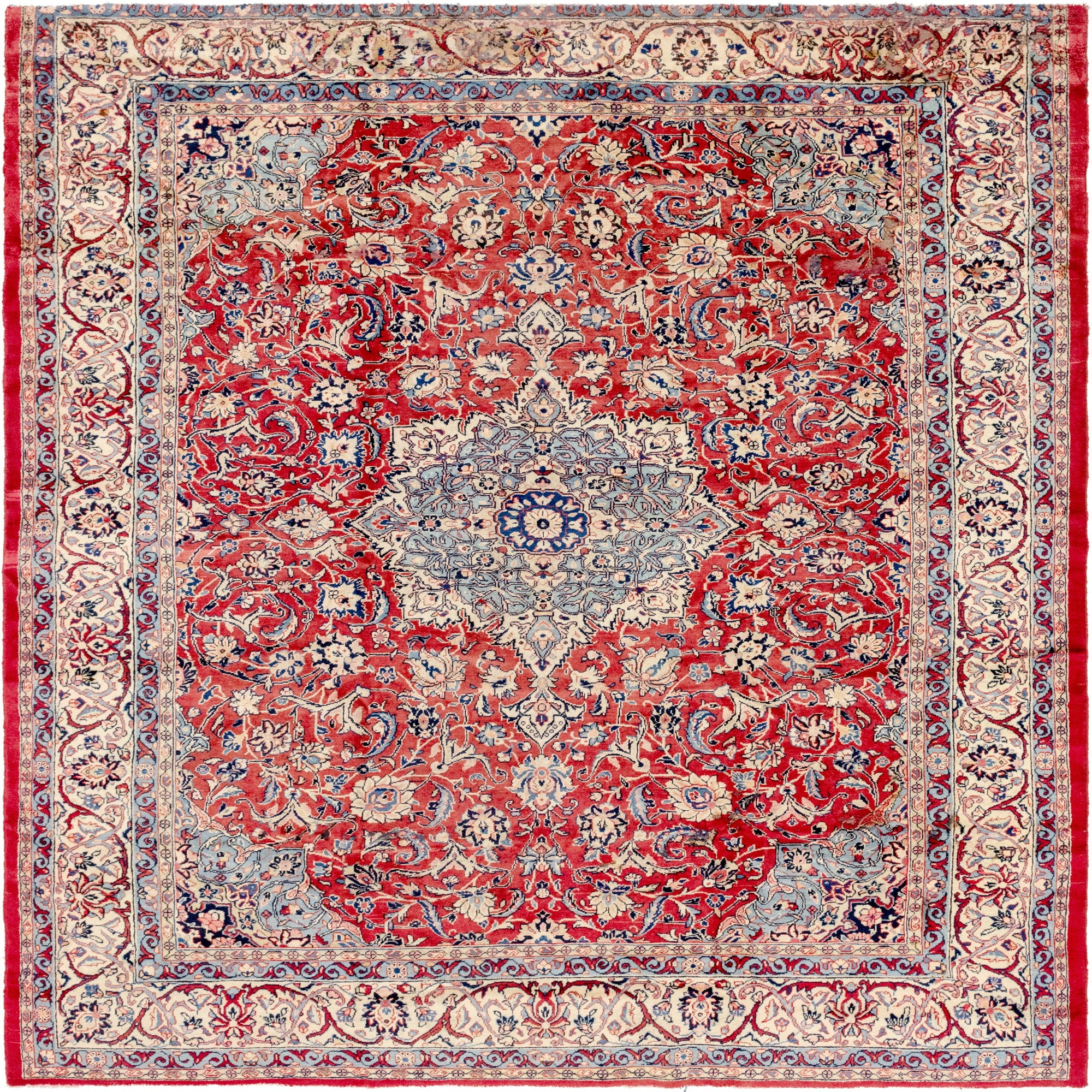 Primary color is Red. Colors in this rug include: Red, Blue, Light Blue, Ivory, Navy Blue, Salmon, Pink.