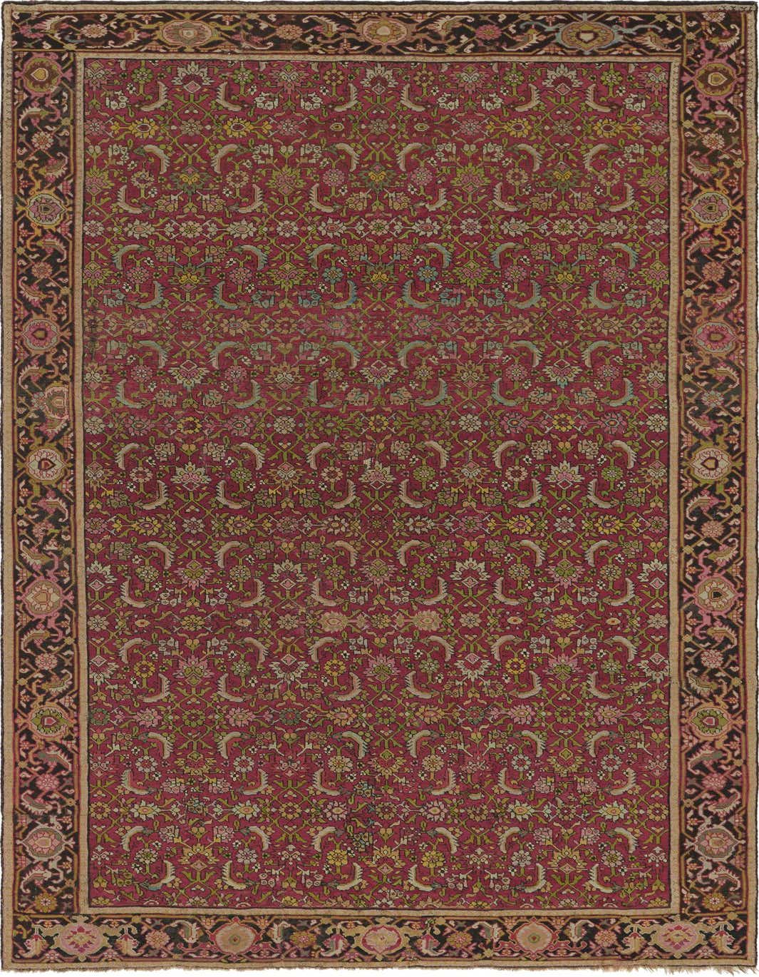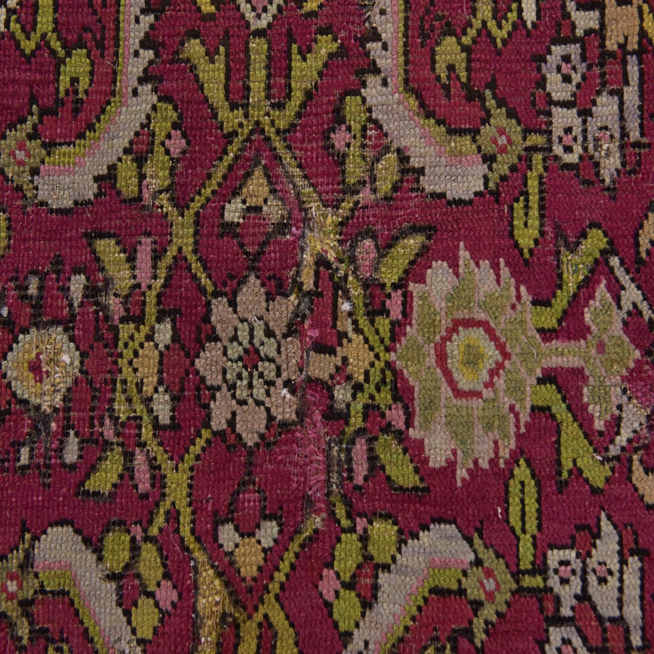 The presence of repair and low pile spots on this antique piece tells a story of its journey through time, while the fringed edges add to the authenticity of its historic character. The color palette and detailed patterning would allow this rug to become a focal point in a room, blending well with both classic and eclectic interior styles. Perfect for a formal living room, grandiose dining area, or a sophisticated study, this rug provides both a touch of elegance and a sense of warmth to any space it inhabits.