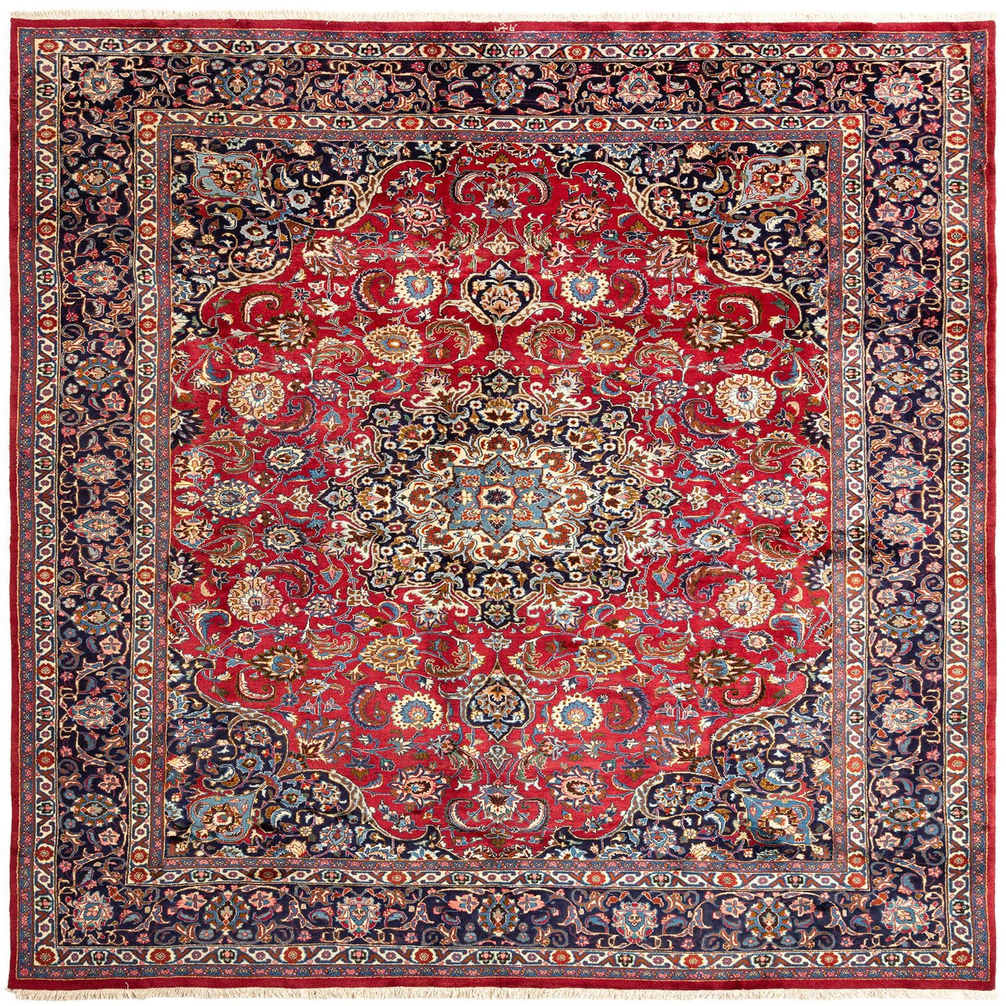 The Mashad Collection presents a distinctive 10x13 rug handcrafted from 100% wool, offering both durability and a plush texture. The rug features a rich red background, beautifully complemented by an array of accent colors, including deep navy, subtle creams, and touches of gold and lighter blues. Intricate floral and foliate motifs are symmetrically arranged, creating an elegant central medallion surrounded by a complementary border.
