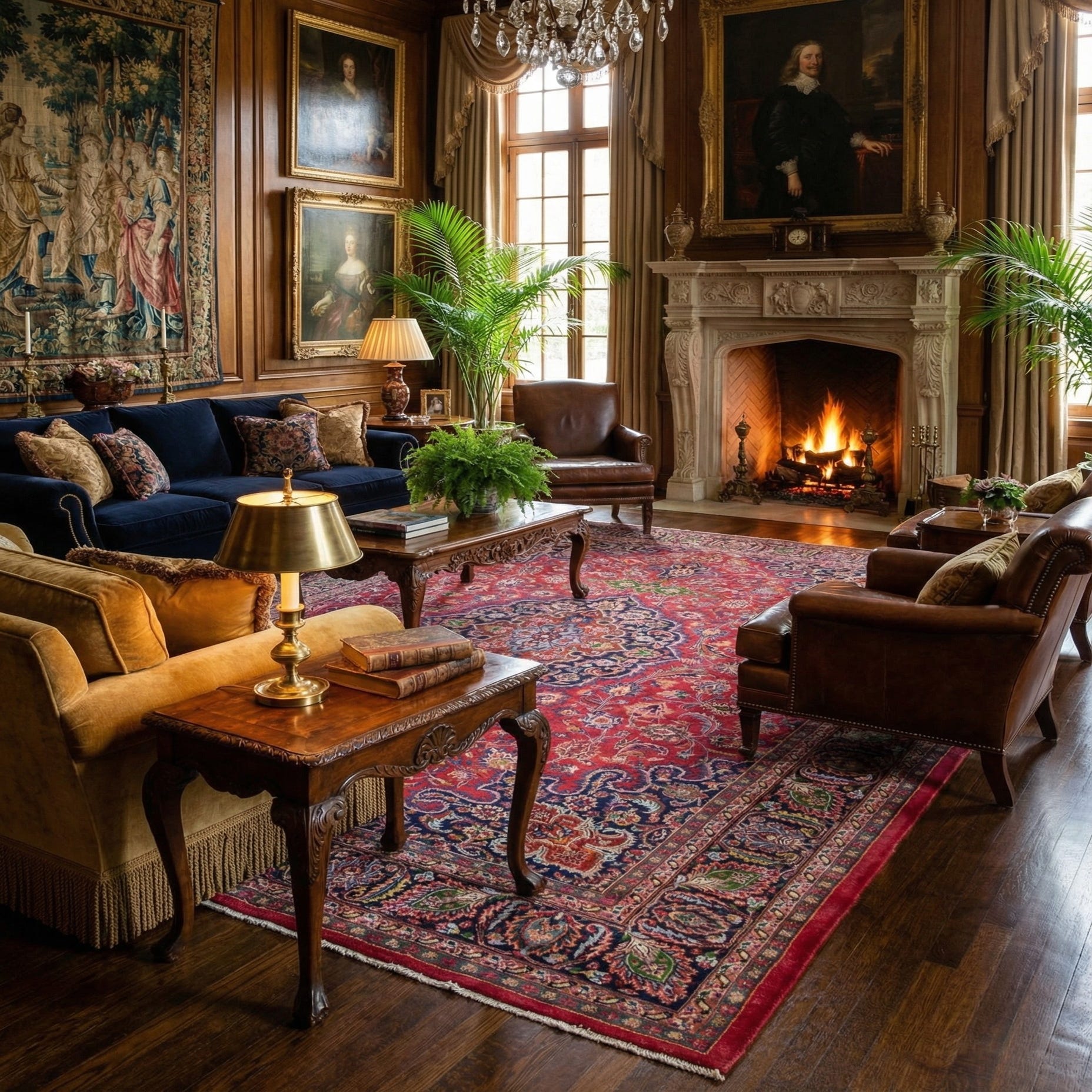 Owing to its robust color scheme and classic design, this rug integrates seamlessly into interiors that favor a traditional aesthetic or aim to create a sense of warmth and sophistication. Its size enables it to act as a grounding centerpiece in spacious living rooms, formal dining areas, or grand entryways. The Mashad rug is well-suited to complement rich wooden furnishings, leather accents, and rooms with a mix of antique and modern elements.