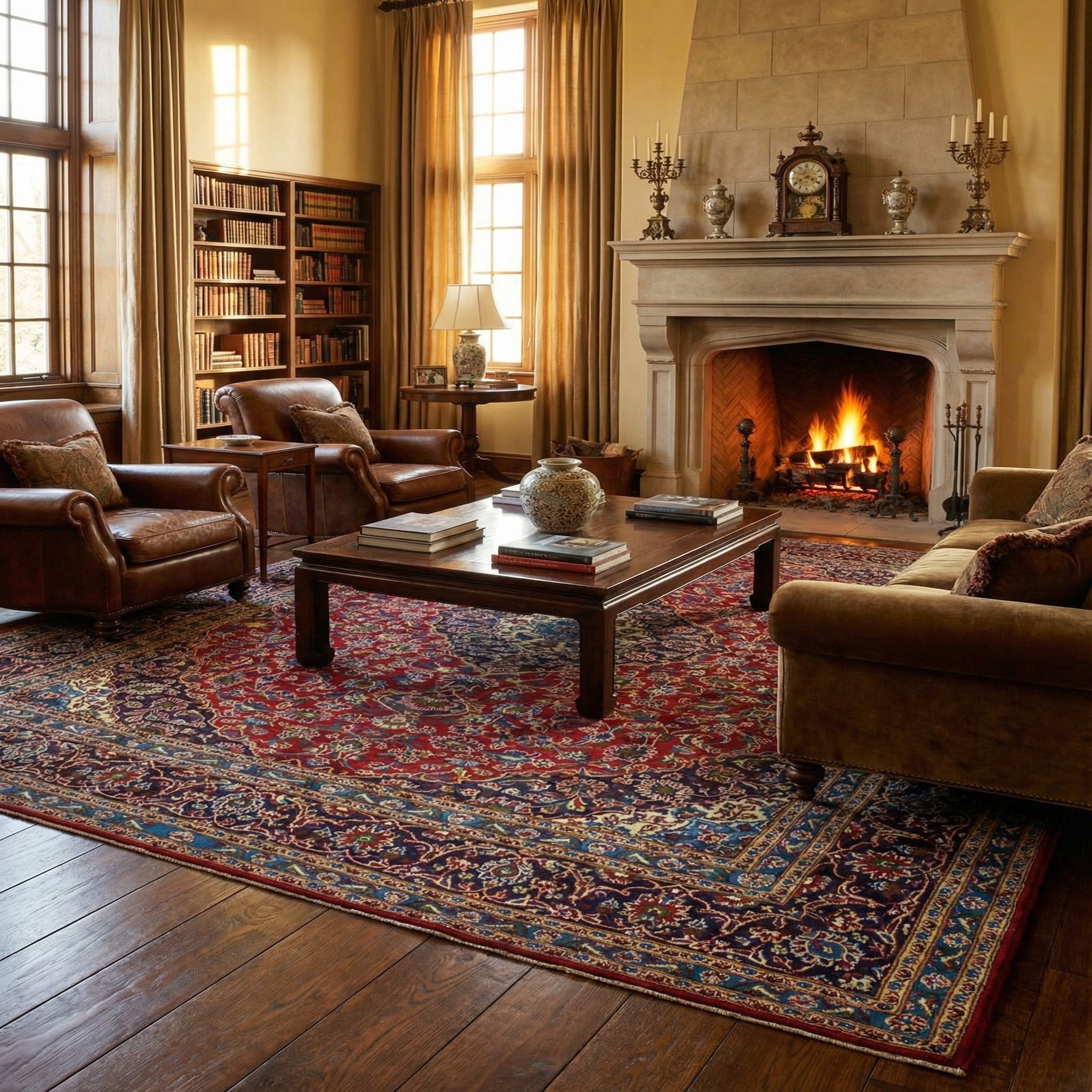Each corner of the rug is finished with a fringe that complements the traditional aesthetic. The precise handiwork and elaborate motifs suggest the rug is suited for spaces aiming to evoke an air of refined elegance. Ideal placements include formal living rooms, grand dining areas, or spacious entryways where the rug's scale and design can be fully appreciated. The Mashad rug will effortlessly elevate traditional, classic, and transitional interiors with its historical charm and rich color palette.