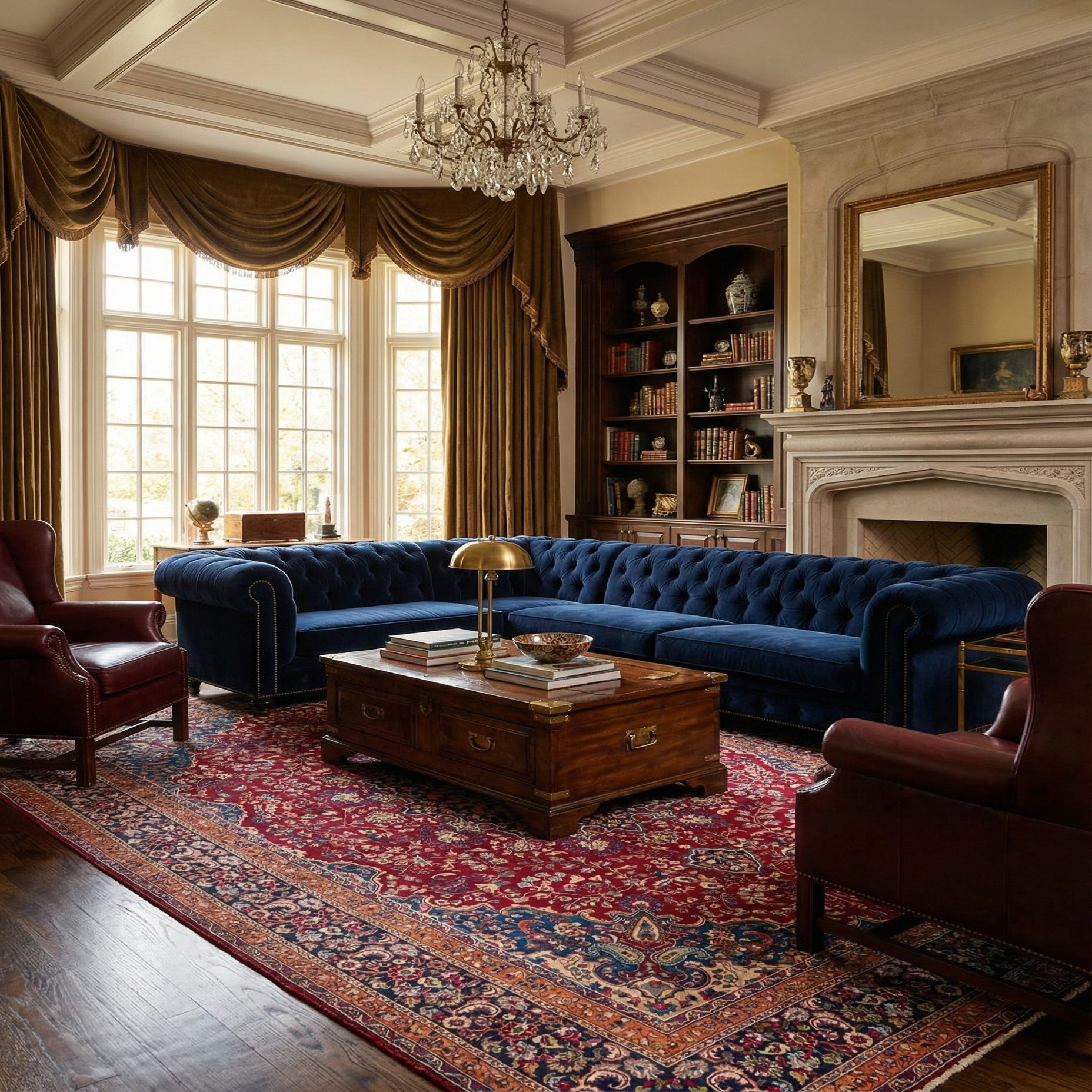 The wool pile has a soft, substantial feel underfoot and a subtle natural luster that highlights knot definition and color transitions. Use this rug to anchor a formal living room or dining area, layer it in a study or library with warm wood furniture and leather seating, or introduce color and pattern to a neutral, transitional space. It pairs especially well with navy or olive upholstery, warm wood tones, and brass or antique metal accents for a collected, finished look.