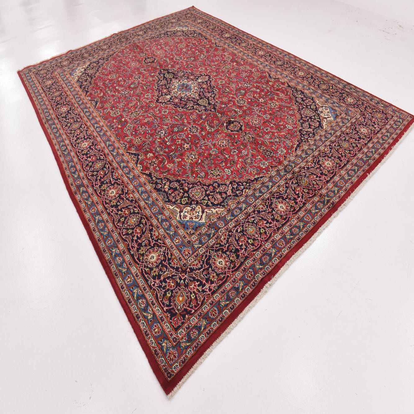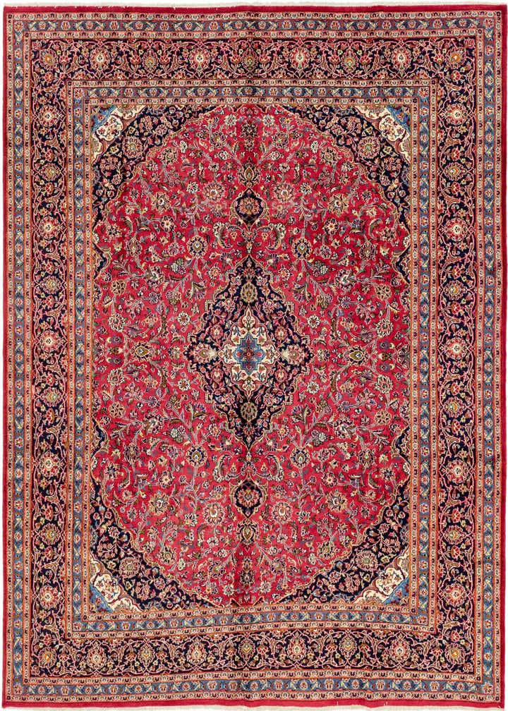 The Mashad Collection presents a hand-knotted 10x13 wool rug showcasing a rich red background. Characterized by its intricate pattern and authentic design, this rug features a symmetrical display of floral motifs and detailed borders that create a classic and timeless appeal. The hues of navy blue, ivory, blue, green, pink, beige, brown, and orange add to the depth and intricacy of the design. The meticulous weave and 100% wool construction ensure a durable texture, while the presence of low pile spots and fringe accents emphasize the piece's semi-antique nature, adding a touch of historic charm.