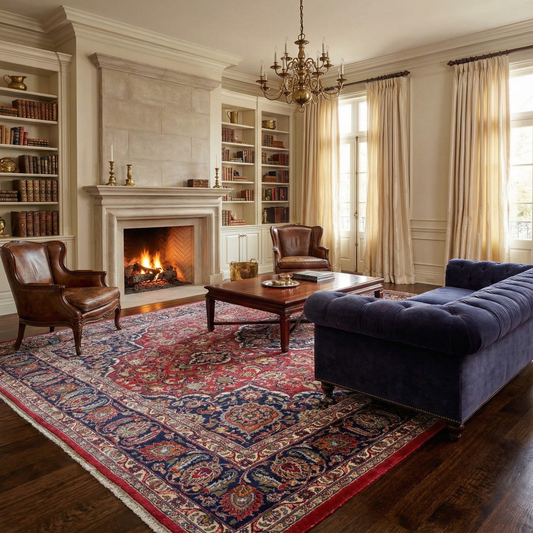 This rug would harmoniously blend into interiors that favor classic elegance, such as traditional living rooms, formal dining spaces, or grand entryways. Its elaborate pattern and warm colors would also make it a focal point in a more eclectic setting, providing a rich contrast to contemporary furniture pieces.