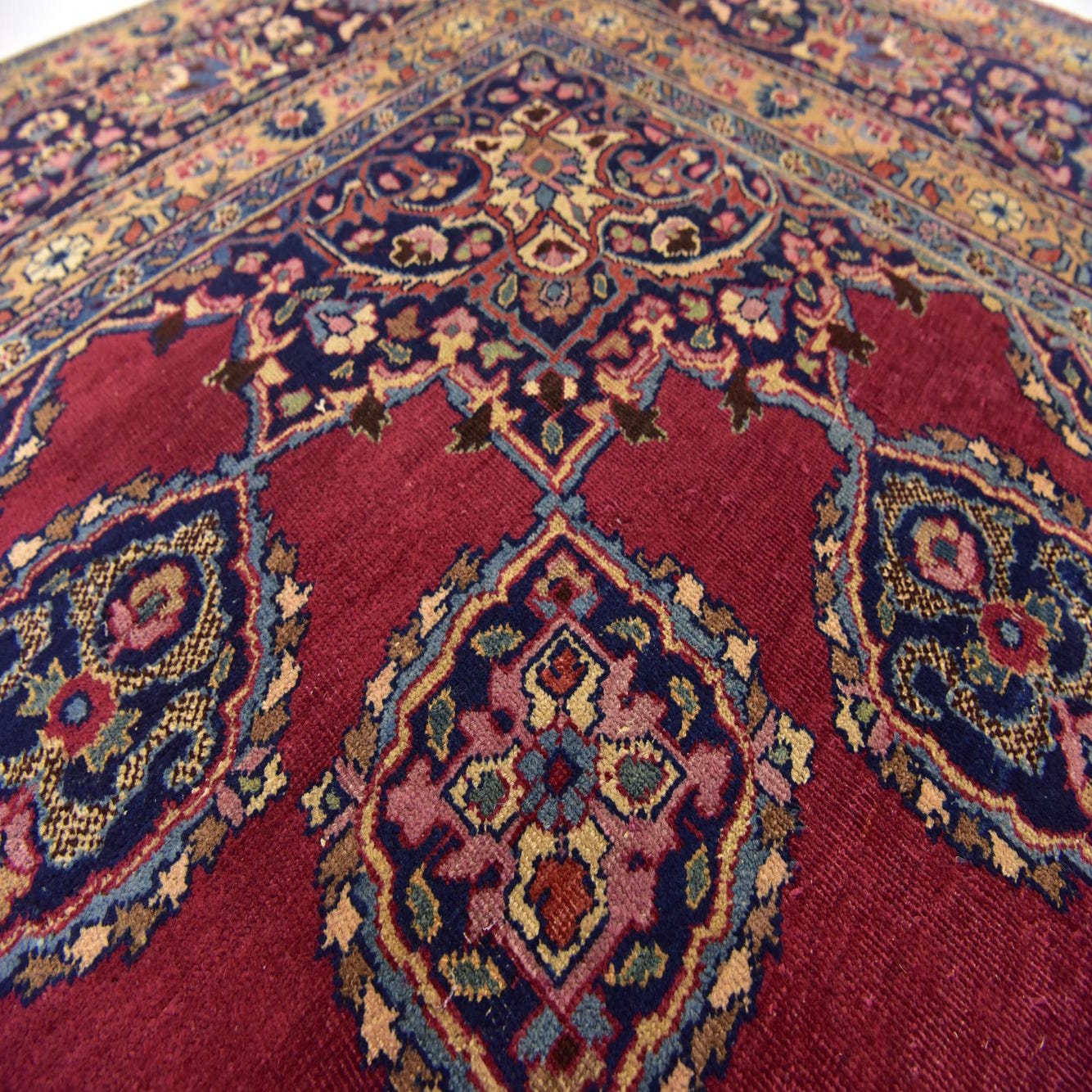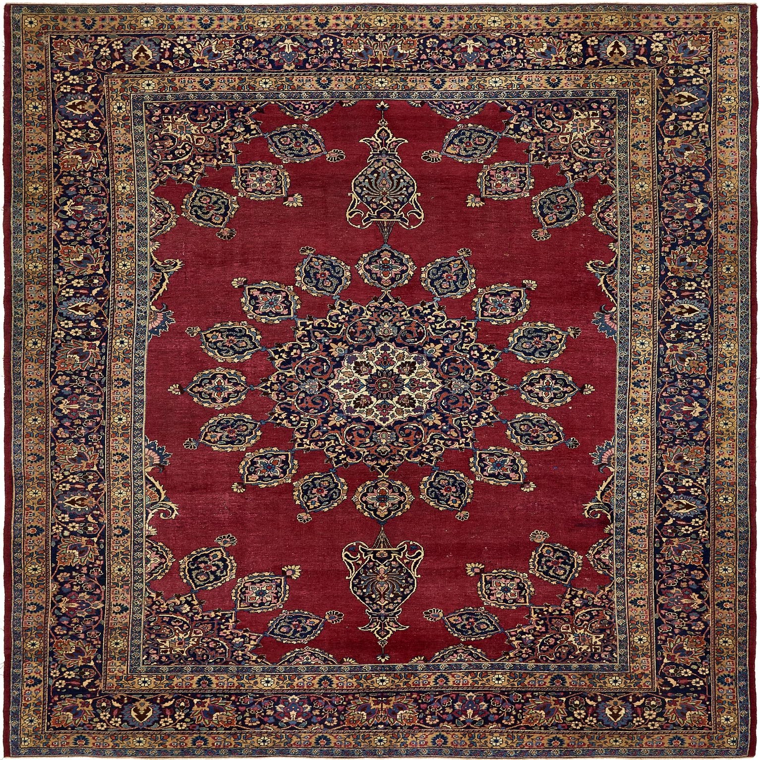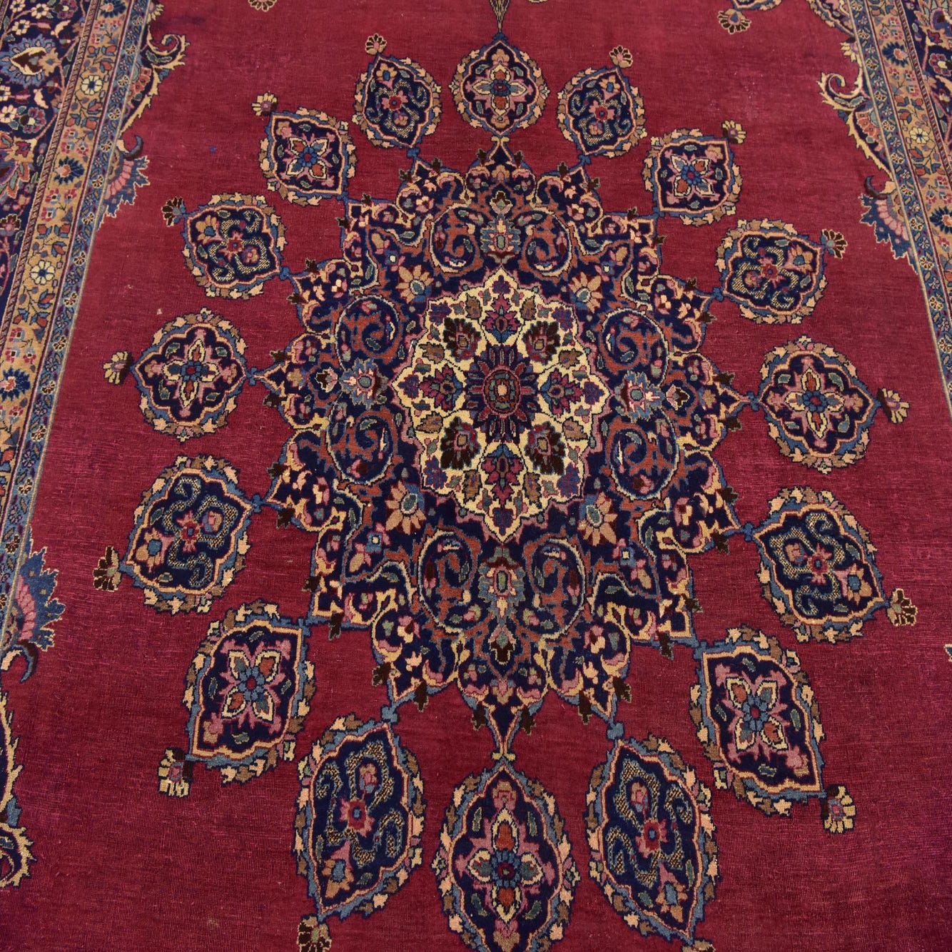 A 10x13 rectangular red Persian wool rug with a central medallion and intricate botanical patterns.