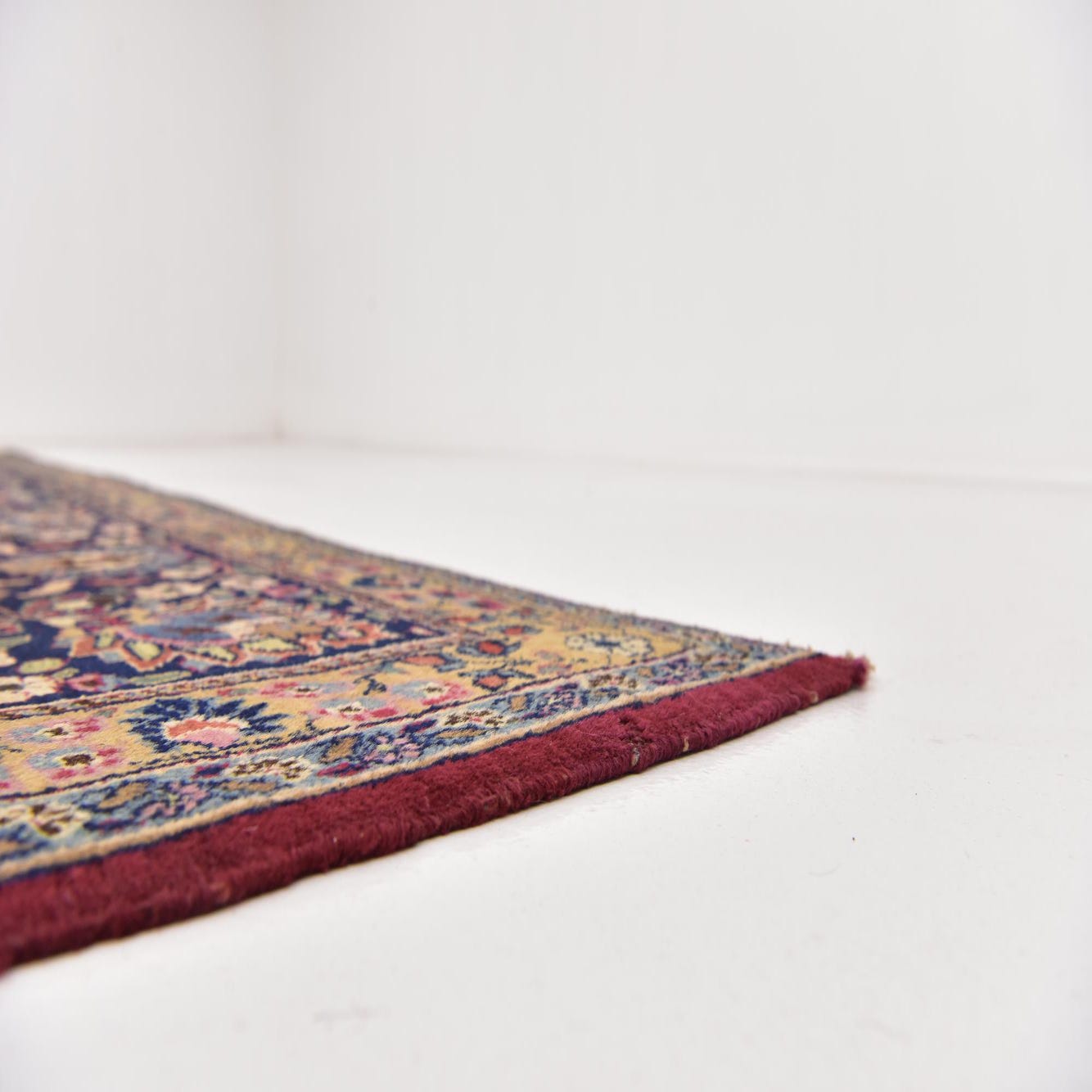 This antique rug, characterised by a low pile, showcases time-honored artistry with a wear that narrates its historical journey. The presence of fringe edges contributes to its authentic appeal. Given its traditional style, this rug harmonizes with classic, vintage, or richly layered interiors, where it can serve as the focal point or complement antique furnishings. Its resilient wool construction makes it a fitting choice for areas with regular foot traffic, where it can add warmth and a discernible character to the space. The vibrant yet tasteful color scheme allows for versatile placement in interiors with warm or neutral color palettes.
