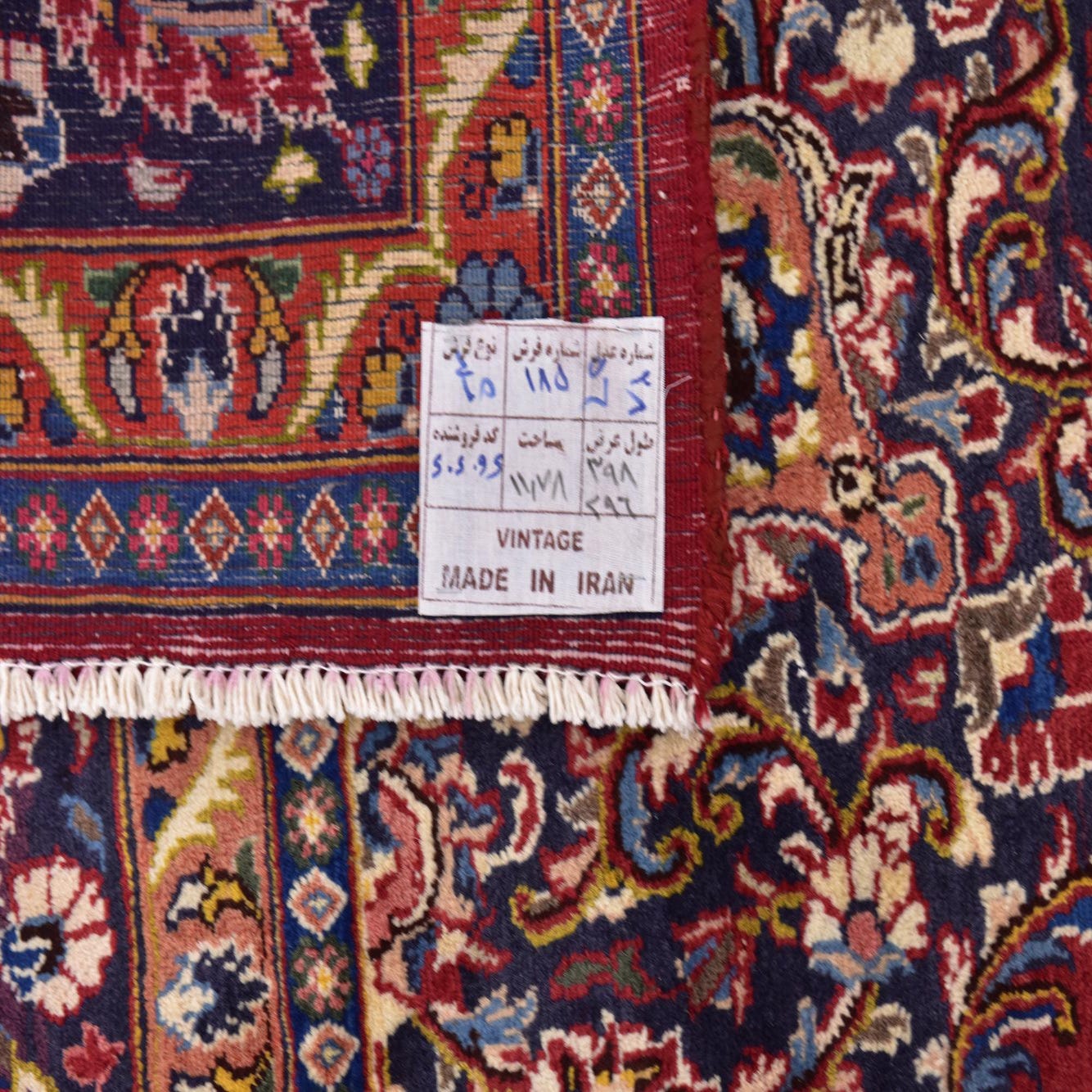 The texture of the rug conveys a sense of history through its lower pile spots, indicating gentle wear that comes with being a semi-antique item, estimated to be 40-60 years old. This feature, along with the rug's distinguished signature of a master weaver, imbues the piece with character and a storied past. Completed with fringe accents, the rug presents a classic and authentic appearance.