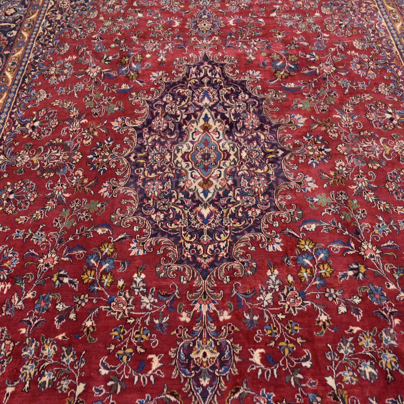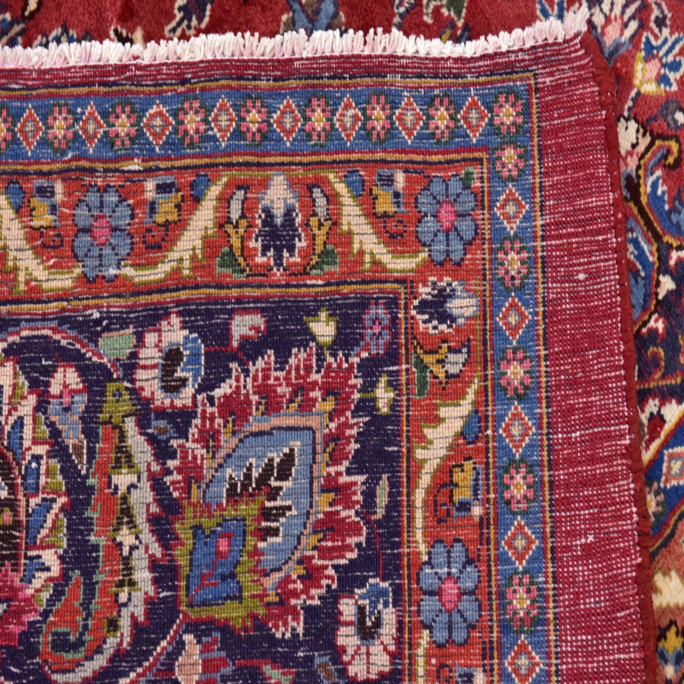 This Mashad collection rug, measured at 10x13 feet, is a testament to the craftsmanship of hand-knotted construction, crafted from 100% wool. The piece carries a rich red background that sets a warm and inviting tone. Its intricate pattern features a complex array of florals and traditional motifs in a well-balanced harmony of hues which include blue, ivory, peach, orange, navy blue, burgundy, olive, and light blue, adding to its visual depth.