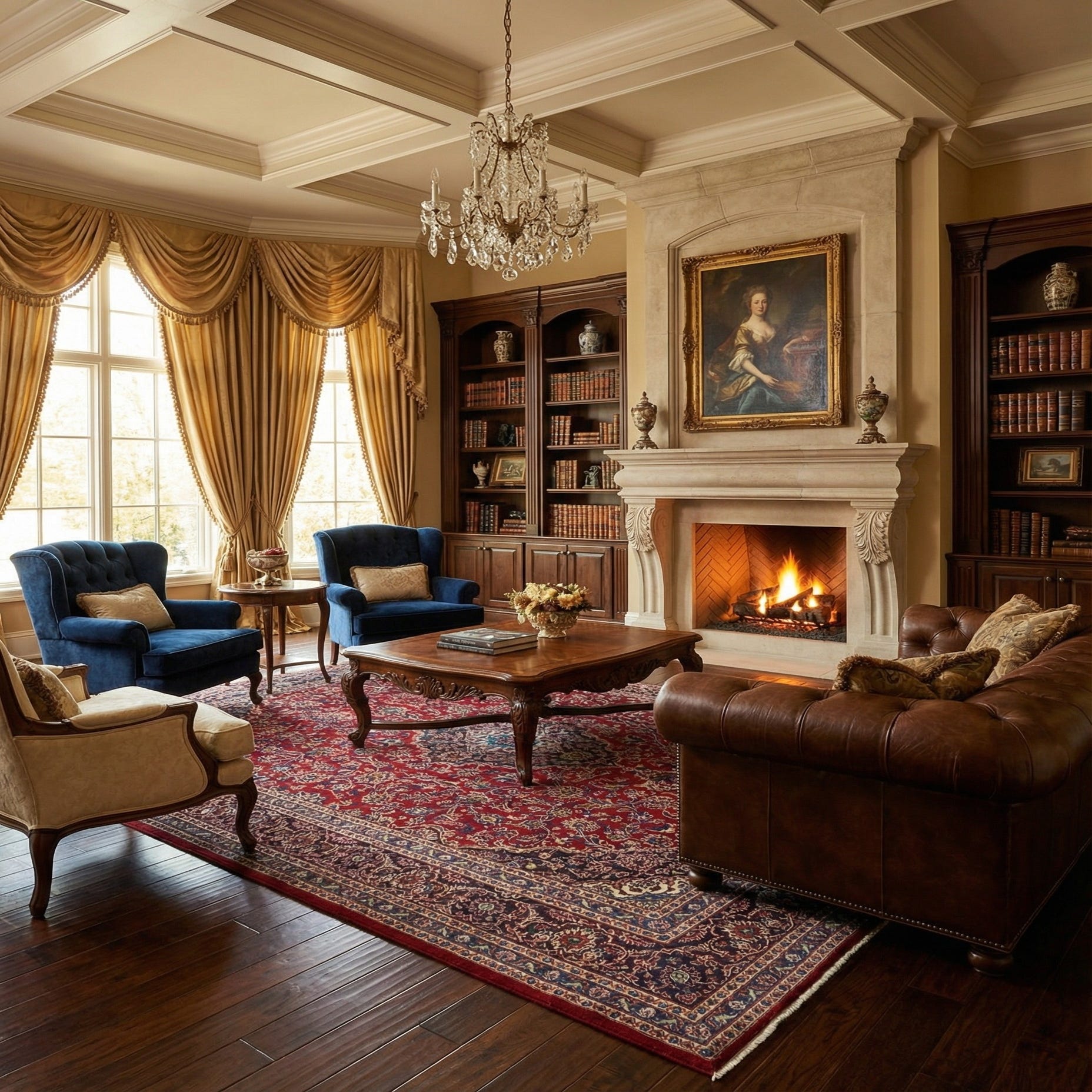 Works well as an anchor for a formal living room or dining area, where its traditional palette pairs naturally with dark wood tables, leather seating, and brass or gold accents. It also complements transitional interiors when balanced with neutral sofas in ivory or tan and navy or olive throw pillows, and it can bring color and depth to a study or entry with hardwood floors.