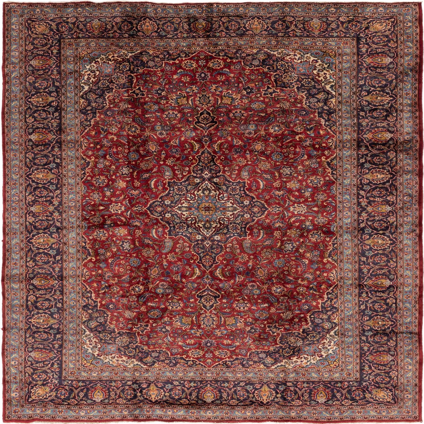 A 10x13 rectangular red Persian Mashad rug with an intricate floral medallion pattern and dark blue border.