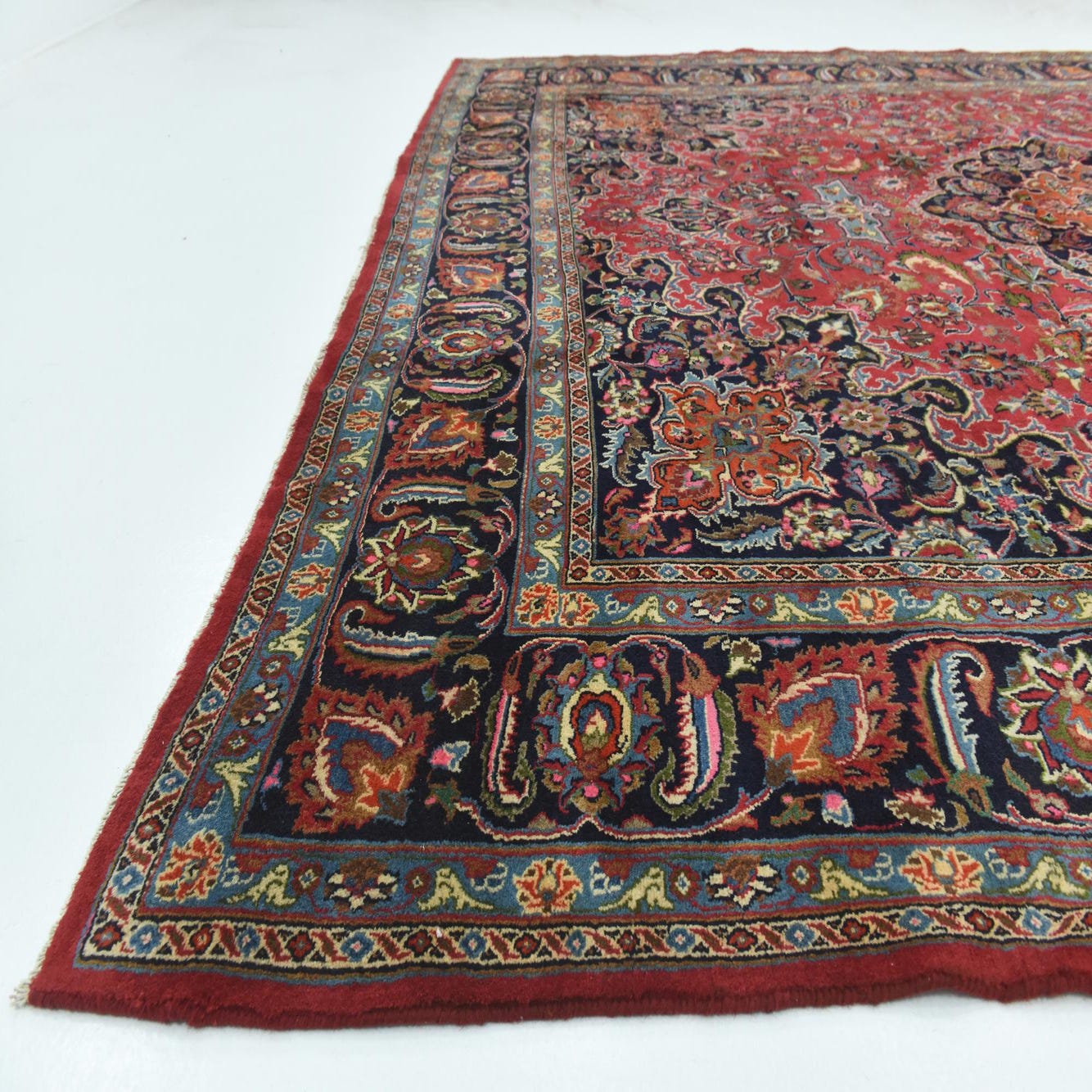 A large 10x13 rectangular red Persian rug with an intricate botanical medallion pattern and a dark border.