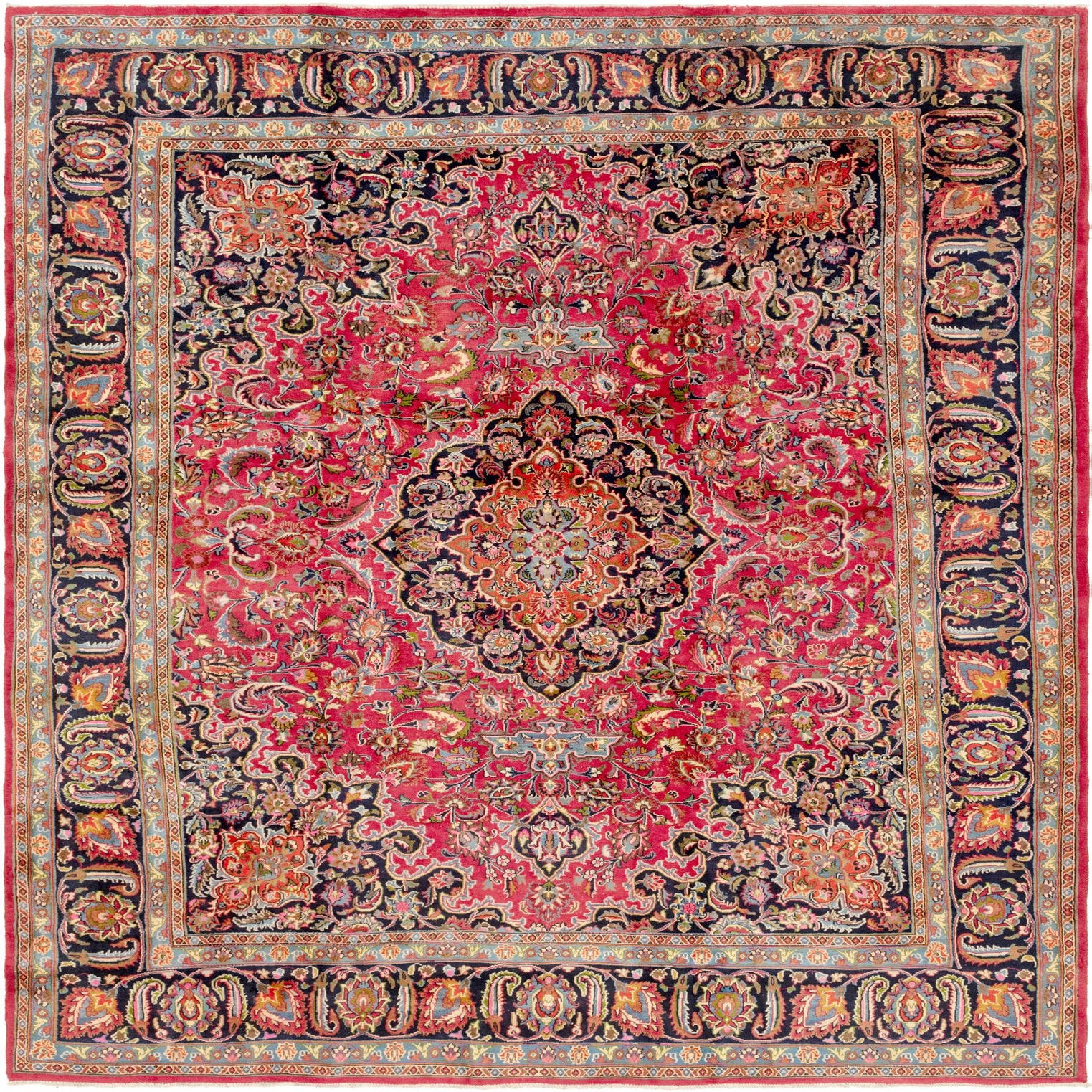 Primary color is Red. Colors in this rug include: Red, Blue, Green, Black, Navy Blue, Ivory, Pink, Puce.