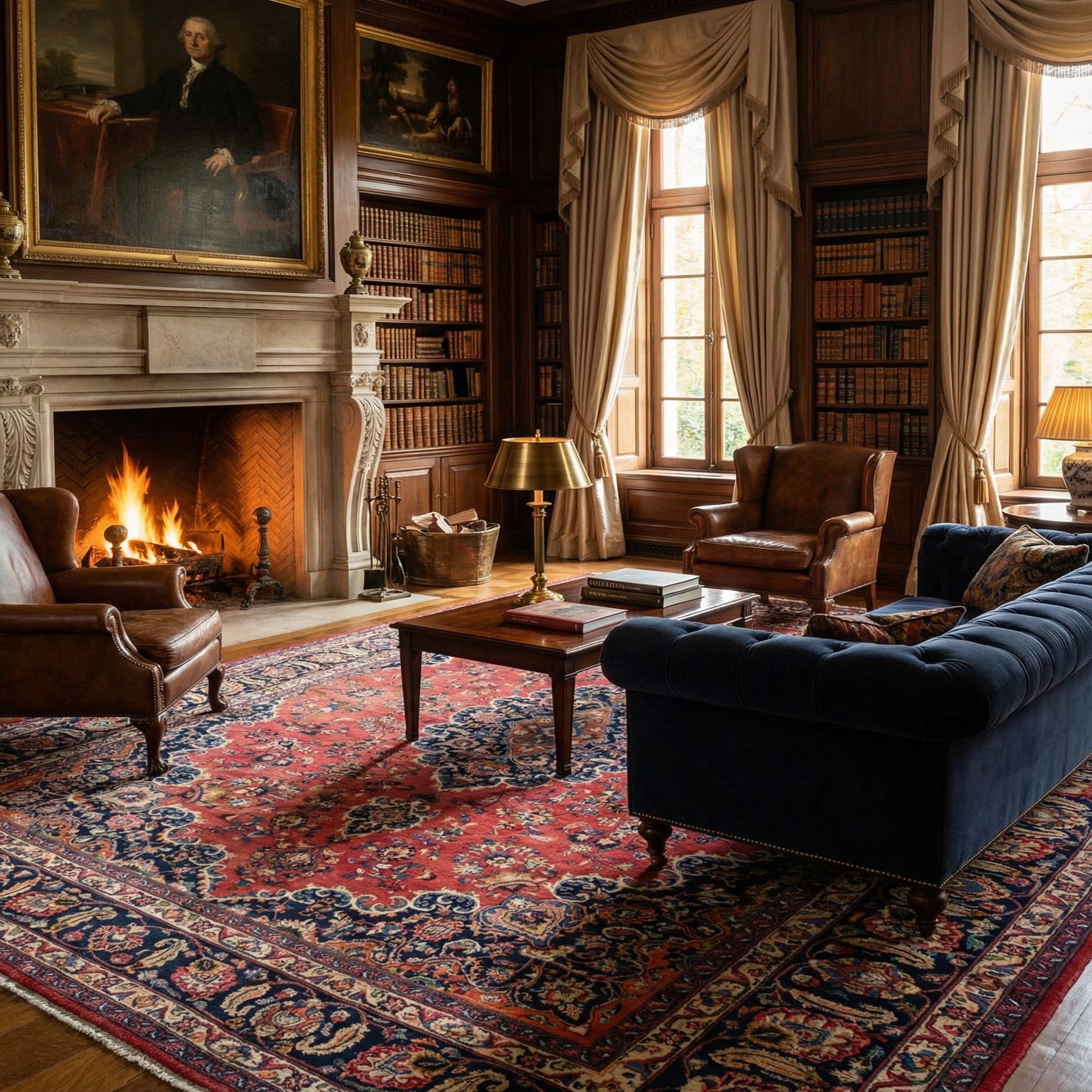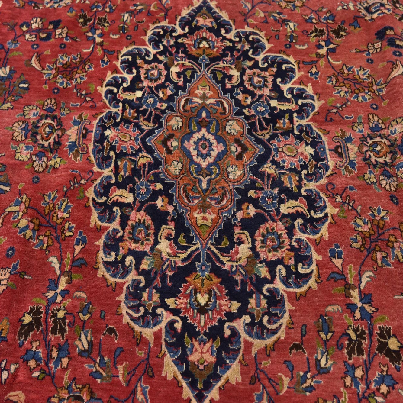 A 10x13 rectangular red Persian rug with a large central navy medallion and intricate floral patterns, ideal for a living room.